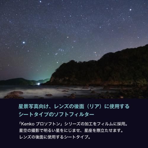 【製品特徴】■お客様からのご要望にお応えして、「リア プロソフトン」(3枚セット)の単体販売を開始いたします■No.050が効果[弱]、No.100が効果[中]、No.150が効果[強]です■夜空に輝く星々の明るさや色を写真で表現するために欠かせないのがソフトフィルターです■数あるソフトフィルターの中でも、星空撮影の定番としてご使用いただいてきたのが、Kenko「プロソフトン」です■「リア プロソフトン」は、プロソフトンの加工をフィルムに採用した、シートタイプのソフトフィルターです■レンズの後面(リア)に装着するタイプで、レンズの前にねじ込み式のフィルターを装着できない超広角レンズでもご使用いただけます■ポリエステル素材のため、レンズ後端形状に合わせてカットして、レンズのリアフィルターホルダーに装着するか、レンズ後面に両面テープで貼り付けて使用します■No.100は、ねじ込み式フィルター「PRO1D プロソフトン[A]」相当のスタンダードなソフト効果■超広角レンズや対角魚眼レンズで撮影し、鑑賞サイズが小さい場合(例えばスマートフォンで眺めるような、SNSへの投稿など)にはもう少し強い効果が良いかもしれません【製品仕様】●サイズ:・ソフト加工部分:約52×54mm・フィルム本体:約57×60mm・厚み:0.18mm※本製品はキズがつきやすいため、取扱いに注意してください※ホコリが付着した場合はブロアー等で払い、指紋等の汚れは柔らかな布に中性洗剤を含ませて軽く汚れだけを拭き、残った水滴は吸水性のよい布で吸い取ってください。乾拭きはキズの原因となることがあります ※商品の仕様・対応をご確認の上、ご購入ください。 `kenkotokina`ケンコーリアプロソフトンNo.100 ※この説明文は楽天市場店の記載内容です。URLはhttps://item.rakuten.co.jp/emedama/で始まります。URLが異なる際はサイトを利用することのないよう十分ご注意ください。 ▼ご注意▼以下の商品は、当商品と互換性に関係なく表示されます。互換性は別途ご確認の上ご注文ください● 商品の返品について