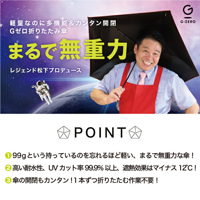 サイズ閉じたとき:約 直径4×21(cm) 開いたとき:約 直径80×50(cm) 骨:5本重量約99g ※数値は多少の誤差が生じます材質傘生地の組成:ポリエステル100% 傘骨:カーボンファイバー、アルミ紫外線遮蔽率99.9%以上生産国中国ご使用上の注意●この製品には尖った部分がございます。常に周囲の安全を確認してご使用ください。 ●強風時には破損する恐れがありますので使用しないでください。 ●持ち手や中棒、骨等が折れたり壊れたりしたままご使用になると、ケガや事故につながる恐れがありますのでご使用を中止してください。 ●振り回したり投げたりしないでください。 ●開く前に空気を含ませるように傘を振り、傘生地が貼りついていないか確認してください。貼りついた状態で開くと故障の原因になります。特に生地が濡れたまま使用される場合は、生地が骨にからみつきやすいため、十分に生地をほぐしてから傘を開いてください。 ●傘以外の用途に使用しないでください。 ●傘生地に防水撥水加工を施しておりますが、激しい雨や長時間のご使用では、生地や縫い目等から水がしみこむことがあります。 ●使用後は陰干しして十分に乾燥させてください。濡れたまま放置すると、色落ちやサビ発生の原因となりますのでご注意ください。 ●火気のそばや直射日光が当たる場所、高温になる場所に置かないでください。 ●傘生地は色落ちする場合があります。乾燥が不十分なまま、衣服やその他の物への接触は避けてください。 ●撥水加工を施しておりますが、経年やお手入れ方法により機能が劣化する場合がございます。 ※お子様には保護者からご注意ください。 ※品質向上のため商品やパッケージは予告なく仕様変更することがございますのでご了承ください。多数メディアで紹介されました!レジェンド松下プロデュース!まるで無重力なGゼロポケット傘POINT 1.約99gという持っているのを忘れるほど軽い、まるで無重力な傘! 2.高い耐水性、UVカット率99.9%以上、遮熱効果がスゴい! 3.傘の開閉もカンタン!1本ずつ折りたたむ作業不要!コンパクトだからバッグに入れても全く気になりません。UVカット率99.9%以上UVカット率99.9%以上!しっかり日差しをブロックしてくれるので日傘としてもお役立ちです。晴雨兼用だから便利。遮熱効果バツグン!晴れの日でも傘の下を涼しく快適にしてくれます。耐強風の丈夫なフレーム【フレーム】傘骨にカーボンファイバーフレームを採用。軽いのに壊れにくい。防水性が高く水・汚れに強い【傘の生地】パラシュートにも使われている生地で、軽量で丈夫。コーティングを重ねることで、耐水性にも優れています。ジャストサイズ親骨の長さは50cmです。親骨の数は、通常の折りたたみ傘は6本が多いですが、軽量化のため、5本にしています。スマートデザイン3段回に伸びます。折りたたみ時は21cm。2段回目は37cm。柄は全長50cm。傘の開閉時に骨を1本ずつ伸ばしたり折りたたんだりする必要がなく、取扱いが簡単です。カラー【NEWカラー】モスグリーンブラックネイビーピンク※販売価格はメーカー希望小売価格です 関連商品はこちらGゼロインソールスポーツ 25cm~28cm |イ...Gゼロインソール 22cm~28cm |インソール...GゼロクッションDXクッション 座布団 椅...Gゼロマットレスパッド敷きパッド付