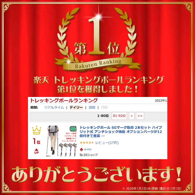 メーカー希望小売価格はメーカーサイトに基づいて掲載しています※概要はキャンペーンページをご確認ください。LAD WEATHER ラドウェザー 安心と信頼のSGマーク取得 トレッキングポール 2本セットアウトドアブランドのラドウェザーから、トレッキングポールが登場。登山中の事故は命にかかわるからこそ、確かな品質の物を使いたい。ラドウェザーのトレッキングポールは、「SG基準」に基づく認証済みの製品の証の「SGマーク」付きなので安心です。シャフトの長さ調整は簡単で安全な「ハイブリット式」を採用。楽に長さ調整が行えます。オプションパーツは6セット(12個)が標準装備!ウォーキングキャップや雪道で活躍するスノーバスケットも付いているので、あらゆるシーンで活躍します。先端のトレッキングキャップは消耗品だから、予備があるのも嬉しい。本体の素材は軽くて強度の高い「超々ジュラルミン」を使用。グリップはコルク製で手に馴染み持ちやすい。もちろん腕の負担を軽減するアンチショック機能もあります。収納袋も付いており、届いたその日からすぐ使えるフルセット!今から登山を始める人にも登山上級者にもおススメです。■安心のSGマークつき!SGマークは、SG基準に適合した安全性の高い商品の証です。小さな欠陥でも命にかかわる重大な事故に繋がるトレッキングポールだからこそ、確かな品質の物を安心して使いたい。■SGマークとは?「SGマーク」とは、Safe Goods(安全な製品)の略で、一般財団法人製品安全協会が定めたマークです。このマークのは、一般財団法人製品安全協会の策定した?厳しい「SG基準」に基づく認証済の製品にのみ表示が許可されており、SGマークの付いた製品には、製品の欠陥による人身事故に対する賠償措置を行う制度があります。すなわちSGマークの付いた製品は、・SG基準に適合している「安全性が高い製品」である事・信頼性の高い第三者に認証された「安心して使用できる製品」である事・製品の欠陥で人身事故が発生した時は「賠償措置が講じられる製品」である事が証明されていると言えます。■長さ調整が簡単なハイブリッド式!中段シャフトは力がいらず調整が簡単なレバーロック式、木の枝や草などがひっかりやすい下段シャフトはシンプルなスクリューロック式。中段と下段に別のロック方式を使用する事で、安全さと便利さを両立しました。■豊富なアタッチメントパーツ付き!トレッキングキャップ×2セット 、 ウォーキングキャップ(2種類)×各1セットバスケット×1セット 、 スノーバスケット×1セット が初めからセットになっていて、別で買い足す必要は無し!消耗しやすいトレッキングキャップが2セットあるのも嬉しい。・バスケット岩に挟まるのを防いだり、砂や土に深く沈み込まないようにします。・スノーバスケット通常のバスケットよりも大きく、雪の上を歩くときに深く埋まるのを防ぎます。・ウォーキングキャップ(2種類)トレッキングキャップより広い面で地面に接する為、安定感があります。・トレッキングキャップ(2セット)路面や本体石突きを保護する基本のキャップです。※お届け時、1セットは本体に装着されています。■腕に優しいアンチショック機能付き!内部のバネで地面を突いた時の衝撃を吸収して、手首や腕への負担と疲労を軽減できるアンチショック機能つき。特に舗装路をウォーキングするときなど、固い地面を歩く時に威力を発揮します。■軽くて強い、超々ジュラルミン製!シャフトにはアルミ合金の中で最高の強度を誇る超々ジュラルミン(A7075)を使用。強度が高いのに軽量なのが特徴で、飛行機や電車にも使用されている素材です。持ち運ぶ時は軽く、使うときはしっかり支えてくれます。■そのまま背負える収納袋付き!ストラップもついており持ち運びにも便利な収納袋付き。使わないときの収納はもちろん、登山の帰り道には収納袋があればポール先端の泥汚れを気にせず鞄に入れることができます。■コルク製のグリップで手に馴染む!グリップは滑りにくく、手にしっかり馴染むコルク製。しっかり握れて安定感も抜群なので、手が疲れにくい。適度な吸水性があり手汗も吸ってくれるので、蒸れにくく汗で滑らない。■長さの調整ができるストラップ!ストラップは簡単に長さ調整できます。手の大きな人も小さな人も、厚手の手袋を着用している時もぴったりの自分サイズで使用できます。カラー01.ブラック02.シルバー03.ブルー04.レッド05.ピンク06.イエロー素材本体:アルミ合金 グリップ:EVA樹脂、木 パーツ:プラスチック 石突:タングステンサイズ収納時長さ:約63cm 使用時長さ:最大約135cm1本の重さ:約280g※手作業による採寸の為、若干の誤差が生じる場合がございます。付属品収納袋 1個バスケット 1セット(2個)スノーバスケット 1セット(2個)ウォーキングキャップ 2セット(4個)トレッキングキャップ 2セット(4個)説明書 1冊備考※掲載画像と実商品のカラーは、モニターの状態等によって若干異なることが