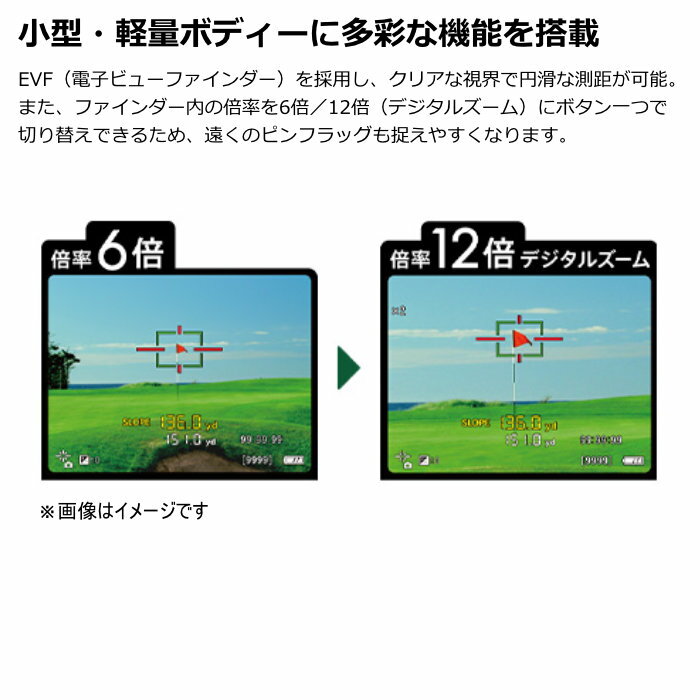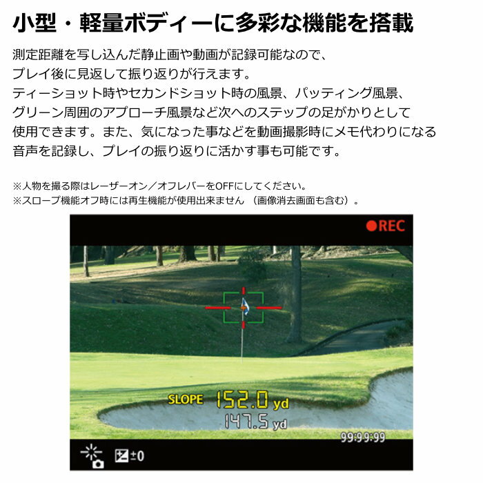 安心梱包についてこちらの商品は通常梱包となります。安心梱包は別途、下記ご注文ページより商品と一緒にご注文下さい。■EVF搭載&拡大可能なデジタルズーム機能EVF(電子ビューファインダー)を採用し、クリアな視界で円滑な測距が可能。また、ファインダー内の倍率を6倍/12倍(デジタルズーム)にボタン一つで切り替えできるため、遠くのピンフラッグも捉えやすくなります。■振り返りに活かせる静止画・動画撮影機能測定距離を写し込んだ静止画や動画が記録可能なので、プレイ後に見返して振り返りが行えます。ティーショット時やセカンドショット時の風景、パッティング風景、グリーン周囲のアプローチ風景など次へのステップの足がかりとして使用できます。また、気になった事などを動画撮影時にメモ代わりになる音声を記録し、プレイの振り返りに活かす事も可能です。※人物を撮る際はレーザーオン/オフレバーをOFFにしてください。※スロープ機能オフ時には再生機能が使用出来ません (画像消去画面も含む)。■持ち歩きやすい小型・軽量ボディー約151g(メモリーカード含む)の小型・軽量ボディーを実現。ポケットサイズで持ち歩きやすく、プレー中の動きを妨げることもありません。付属のケースはベルト装着が可能なため、さっと取り出して、さっとしまうことが可能です。また、IPX4相当の防滴性能を備えており、雨天時でも使用可能です。※※距離計は防滴に配慮した構造ですが、水滴などの侵入を完全に防ぐものではありません。※防滴性能を発揮させるため、端子カバーをしっかり閉じる必要があります。※水滴や霧などにより、目標物までの距離が正確に測れないこともあります。■測距範囲・約7.0yd.〜800yd./約6.4〜732m(測距対象物まで) ※ 測距対象や環境によっては測距範囲が制限されることがある■測距精度・7.0yd.以上100yd.未満(6.4m以上91m未満):±1.0yd.(±0.91m)・100yd.以上800yd.未満(91m以上731m未満):±2.0yd.(±1.83m) ※ 直線距離測定時、キヤノン試験基準による ※ PowerShot GOLFは簡易距離計のため、測距結果は公的な証明などに使用不可■表示ステップ・加減算距離(上段):0.5yd./0.5m・直線距離(下段):0.5yd./0.5m■倍率・約6倍/12倍(約410/820mm時) ※ 820mmはデジタルズーム■大きさ・(幅)×(高さ)×(奥行):約31.0×58.9×91.2mm■質量・約151g/約150g(メモリーカード含む/本体のみ)■電源・リチウムイオン電池(内蔵型)USB充電/給電 ※ Type-C 5V/1.0A以上。 ※電源アダプターは別売です。■インターフェース・有線:USB Type-C・WI-Fi:非搭載・Bluetooth:非搭載■充電時間・約2時間30分 ※ USB電源アダプター PD-E1使用時 ※ 充電時間や充電される量は周囲の温度や残量によって異なる■防滴性能・IPX4相当 ※ 防塵は非対応■レーザー規格・IEC60825-1:Class 1 laser product・FDA 21 CFR Part 1040.10:Class I Laser Product■焦点距離・F値(35mm判換算)・51mm・F3.9(約410mm相当 ※ 820mmはデジタルズーム)■有効画素数・最大約1100万画素■センサーサイズ・1/3型CMOSセンサー■動画記録・動画記録サイズ フルHD:1920×1080 ※ 動画記録サイズの変更不可 ※ 約820mm相当(35mm判換算)時はデジタルズームのため画質が低下する・一回の撮影上限時間 59秒・NTSC設定時:30.00fps/24.00fps.、PAL設定時:25.00fps■電子ビューファインダー・型式:OLEDカラービューファインダー・画面サイズ:0.39型・ドット数:約236万ドット■オートフォーカス・コントラスト検出方式■記録メディア・microSD/microSDHC/microSDXCメモリーカード ※ UHS-I対応■静止画撮影可能枚数・約200枚■映像表示可能時間・約1時間40分 ※ フル充電時、常温+23℃/73°F■露出補正・±3段(1/3段ステップ)■手ブレ補正・レンズシフト方式 ※ 2軸(Pitch/Yaw)補正■連続測距・対応 ※ 測定ボタンを半押し状態で長押しすると、最大約8秒間、レーザーが照射される。その後ピンロック機能により、測距対象が検出される。■バイブレーション・対応 ※ [バイブレーション]を[する]にすると、測距完了時、または連続測距時にファインダーに〈旗マーク〉が表示されると同時に、本体が振動して通知■本体構成・PowerShot GOLF本体・ケース(※メモリーカード、電源アダプター、インターフェースケーブル、ストラップは別売です。)■商品の特長・仕様に関する詳細はメーカーホームページでもご覧頂けます。キヤノン ゴルフ距離計 PowerShot GOLF レーザー距離計 PSGOLF EVF内蔵 手ブレ補正機能 ピンロック・連続測距機能 スロープ機能 バイブレーション機能 カラー表示■送料区分:60サイズ