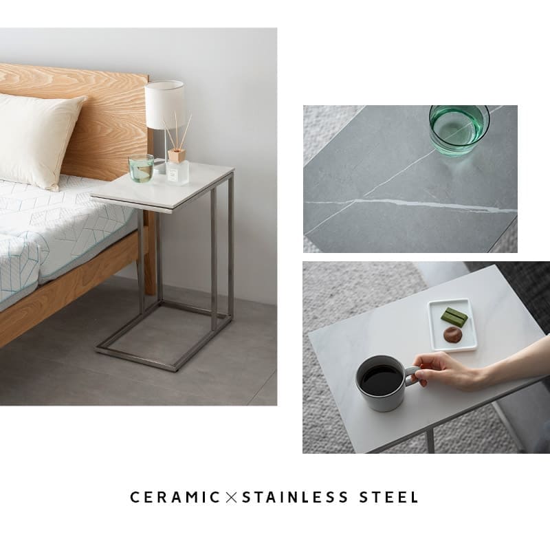 STAFF VOICE -スタッフおすすめポイント- CERAMICA (セラミカ) セラミック サイドテーブル ソファにもベッドにもぴったり寄り添う。上質なセラミックが美しい、高級感と機能性を兼ね備えたサイドテーブル。洗練されたデザインが、インテリア全体の雰囲気を格上げします。 ■こんな方におすすめ! ・ホテルのような上質なインテリアを好む方 ・高級感のある家具をお求めの方 ・インテリアのレイアウトにこだわり、多用途に使える家具を探している方 ・ベッドやソファの周りをすっきり快適に整えたい方 ■上品な大理石調セラミック天板 プリント加工ではなく、リアルな質感を持つセラミック天板を採用。マットな仕上がりで、指紋や汚れが目立ちにくく、落ち着いた空間を演出します。 ■耐久性とメンテナンス性を両立 耐熱・防水・耐摩耗など、多機能を備えた美しさと実用性を両立。滑らかでサラサラとした天板は、お手入れが簡単。シックな色合いや上質な雰囲気を長期間キープし、暮らしの雰囲気をワンランクアップします。 ■光をやわらかく反射するフレーム 光沢を抑えたヘアライン加工が施されたステンレス脚は、無機質すぎず、ほどよい高級感を演出。手触りがよく、指紋も目立ちにくい仕様です。 ■省スペースでも置けるコンパクト設計 小さいけれど、頼れるサイズ感のサイドテーブルは、限られた空間でも圧迫感なく使え、持ち運びも簡単。必要な時だけ引き出せる、フレキシブルさが魅力です。 ■隙間に差し込みやすいC字型構造 脚がC字型になっており、家具の下に差し込むように配置が可能。手元までテーブルを引き寄せられるから、スマホやドリンクを置くのにも便利です。ソファにもベッドにも、ぴったり寄り添います。 ■こんなシーンに大活躍! ・リビングルーム:ソファサイドに配置し、飲み物や雑誌を置くテーブルとして。 ・ベッドルーム:ナイトテーブルとして、照明や目覚まし時計の設置に。 ・ホームオフィス:ワークスペースのサイドテーブルとして、資料やデバイスの配置に。 ・エントランスや廊下:ディスプレイテーブルとして、花やアート作品の展示に。 ※PC環境により実際のカラーと多少異なることもございます。ご了承ください。 商品詳細 品名 【CERAMICA】 セラミック サイドテーブル サイズ 全体:約幅30×奥行45×高さ55cm 天板:約幅30×奥行45×厚さ1.1cm 組成 フレーム:ステンレススチール(ヘアライン仕上げ) 天板:セラミック カラー グレーストーン ホワイトマーブル ※ライン状の模様は、素材の特徴を再現したものです。傷ではございません。あらかじめご了承ください。 仕様 天板滑り止め付き 製品重量 約5.2kg 耐荷重 約10kg 組立 組立不要(完成品) 製造国 中国 配送 こちらの商品は送料無料です。 商品情報変更日 変更日:2025年9月4日 変更点:天板を大理石→セラミックに変更