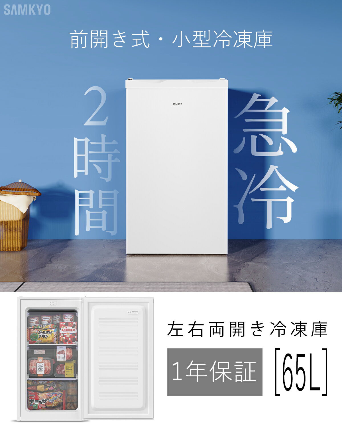 冷凍庫 小型冷凍庫 急冷 65L 前開き式 2時間急冷 家庭用 小型 冷凍ストッカー コンパクト 耐熱天板 前開き 温度調節4段階 一人暮らし 静音 ホワイト SAMKYO ZU60
