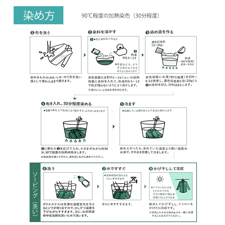 みや六染のECO染料について ご家庭で安心、安全にお使いいただけるよう、原料を厳選し、日本国内自社工場での生産にこだわったECO染料です。ポリエステルダイ/濃色促進剤は、2017年11月に「ECO PASSPORT」を取得しました。 商品について 商品名 ポリエステルダイ 商品説明 ポリエステル100%繊維専用のECO染料です。 お湯約9〜9.5Lに対し、染料と濃色促進剤を入れ加熱染色するだけでポリエステル100%繊維の染色が楽しめます。(加熱ソーピング不要) 1箱で、布約250g(ブラウス1〜2枚分)の染色ができます。 ※ポリエステル混紡繊維を染色の場合は、ポリエステルダイではなく、コールダイホットと濃色促進剤を使用すると繊維全体がきれいに染まります。 コールダイホットはこちら>> コールダイホットF(ファンシーカラー)はこちら>> 濃色促進剤はこちら>> セット内容 染料20g・濃色促進剤20g・染め方説明書 原産国 日本製 発売元 桂屋ファイングッズ株式会社 備 考 ※画像は閲覧環境により実際のお色と異なる場合がございます。 ※パッケージのデザインは予告なく変更になる場合がございます。 ※メール便の場合は商品をそのまま封筒に入れるかたちの簡易包装とさせて頂いております。