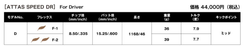 スリクソン/SRIXON ZXi /ZX5 /ZX7 /MKII /XXIO eks スリーブ装着シャフト UST Mamiya ATTAS SPEED DR 羽のように軽やかに、速く ■SPEED×しなやかさ=理想のスイング。 SPEED感を得られる軽量設計としなやかにしなる動きが合わさったシャフト。 ■ATTASシリーズ最軽量モデル ATTASシリーズ最軽量モデルが全番手で新登場。SPEED感のある軽快さとしなやかさで鋭く振り抜ける。 30g台の軽量設計。(IRは40g台) ■DR/FW/HYは2フレックス展開 DR/FW/HYは2フレックス展開することにより幅広いゴルファーのニーズに対応。 スタンダードな「F-1」と少ししっかりした「F-2」の2フレックス展開。 ■シャフトの軽さと柔らかさをフレックス表記の羽で表現 F-1とF-2の「F」は「羽」を意味する「Feather」の「F」で表記。 【必ずお読みください】 【使用スリーブ】 SRIXON スリクソン スリーブ .335 (社外品) ・右打ち用 ※デザイン・形状・文字表記等が画像と一部異なる場合がございます 【使用グリップ】 ・標準装着グリップは選択肢よりお選びください。 ・標準装着グリップ以外のグリップを装着ご希望の場合、必ずオプション【装着グリップ】を「その他のグリップ(別料金)」に設定頂き、シャフトと同時にご注文下さい。 ・「装着無し」をお選びいただいた場合、グリップは同梱されませんのでご了承ください。 【シャフト・クラブのご注意点】 ・オプション【クラブ長さ】は『ヘッドを装着した状態でのクラブの長さ』となります。シャフト単体の長さではございません。 ・オプション以外のクラブ長さをご希望の場合はお手数ですが備考欄にご記入下さい。 ・標準のシャフトロゴ向きは裏挿し、グリップロゴ向きは表挿しとなります。 ※シャフト・グリップのロゴ向きに関しましては、ご希望があれば備考欄にてご指示ください。 ・スイングバランス調整、シャフト振動数測定、シャフトスパイン調整は行っておりません。 ※この商品はオーダーメイドになります。ご注文後にキャンセルや変更をすることはできませんのでご注意ください。 ・ヘッド、スクリュー(ネジ)、トルクレンチは付属しません。 ・受注してからの組立の為、追って納期のご連絡を申し上げます。 ・在庫の状況によって納期が遅れる場合があります。 ・混雑時には多少お時間をいただく場合があります。 ・パーツ(シャフト・グリップ)在庫が欠品している場合は入荷後の納期となります。 ■SPEC 写真のカラーは、お使いのモニター環境によって、現物と異なる場合がございます。 デザイン・仕様・カラーは改良の為、予告無く変更する場合がございます。