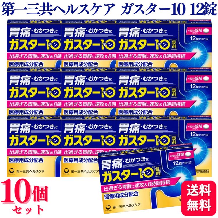 【お客様へ】第1類医薬品をご購入いただく前に、下記の注意事項をお読みください ガスター10S錠 薬効分類 ヒスタミンH2受容体拮抗剤含有薬 製品名 ガスター 10 S錠 製品名(読み) ガスター10Sジョウ 製品の特徴 「ガスター10 S錠」は,胃の症状の原因となる胃酸の出過ぎをコントロールし,胃粘膜の修復を早める薬で,胃酸中和型の胃腸薬とは異なるタイプの胃腸薬です。 本剤は口の中の水分を含むと速やかに溶け崩れ,水なしでも服用できる口中溶解タイプの薬です。 使用上の注意 ・3日間服用しても症状の改善がみられない場合は,服用を止めて,この文書を持って医師又は薬剤師に相談して下さい。・2週間を超えて続けて服用しないで下さい。 (重篤な消化器疾患を見過ごすおそれがありますので,医師の診療を受けて下さい) ■してはいけないこと(守らないと現在の症状が悪化したり,副作用が起こりやすくなります) 1.次の人は服用しないで下さい。 (1)ファモチジン等のH2ブロッカー薬によりアレルギー症状(例えば,発疹・発赤,かゆみ,のど・まぶた・口唇等のはれ)を起こしたことがある人 (2)医療機関で次の病気の治療や医薬品の投与を受けている人 血液の病気,腎臓・肝臓の病気,心臓の病気,胃・十二指腸の病気,ぜんそく・リウマチ等の免疫系の病気,ステロイド剤,抗生物質,抗がん剤,アゾール系抗真菌剤 (白血球減少,血小板減少等を起こすことがあります) (腎臓・肝臓の病気を持っている場合には,薬の排泄が遅れて作用が強くあらわれることがあります) (心筋梗塞・弁膜症・心筋症等の心臓の病気を持っている場合には,心電図異常を伴う脈のみだれがあらわれることがあります) (胃・十二指腸の病気の治療を受けている人は,ファモチジンや類似の薬が処方されている可能性が高いので,重複服用に気をつける必要があります) (アゾール系抗真菌剤の吸収が低下して効果が減弱します) (3)医師から赤血球数が少ない(貧血),血小板数が少ない(血が止まりにくい,血が出やすい),白血球数が少ない等の血液異常を指摘されたことがある人 (本剤が引き金となって再び血液異常を引き起こす可能性があります) (4)フェニルケトン尿症の人(本剤はL-フェニルアラニン化合物を含んでいます) (5)小児(15歳未満)及び高齢者(80歳以上) (6)妊婦又は妊娠していると思われる人2.本剤を服用している間は,次の医薬品を服用しないで下さい。 他の胃腸薬3.授乳中の人は本剤を服用しないか,本剤を服用する場合は授乳を避けて下さい。 ■相談すること 1.次の人は服用前に医師又は薬剤師に相談して下さい。 (1)医師の治療を受けている人又は他の医薬品を服用している人 (2)薬などによりアレルギー症状を起こしたことがある人 (3)高齢者(65歳以上) (一般に高齢者は,生理機能が低下していることがあります) (4)次の症状のある人 のどの痛み,咳及び高熱(これらの症状のある人は,重篤な感染症の疑いがあり,血球数減少等の血液異常が認められることがあります。服用前にこのような 症状があると,本剤の服用によって症状が増悪し,また,本剤の副作用に気づくのが遅れることがあります),原因不明の体重減少,持続性の腹痛(他の病気が 原因であることがあります)2.服用後,次の症状があらわれた場合は副作用の可能性がありますので,直ちに服用を中止し,この文書を持って医師又は薬剤師に相談して下さい。 [関係部位:症状]皮膚:発疹・発赤,かゆみ,はれ循環器:脈のみだれ精神神経系:気がとおくなる感じ,ひきつけ(けいれん)その他:気分が悪くなったり,だるくなったり,発熱してのどが痛いなど体調異常があらわれる。 まれに次の重篤な症状が起こることがあります。その場合は直ちに医師の診療を受けて下さい。 [症状の名称:症状]ショック(アナフィラキシー):服用後すぐに,皮膚のかゆみ,じんましん,声のかすれ,くしゃみ,のどのかゆみ,息苦しさ,動悸,意識の混濁等があらわれる。皮膚粘膜眼症候群(スティーブンス・ジョンソン症候群):高熱,目の充血,目やに,唇のただれ,のどの痛み,皮膚の広範囲の発疹・発赤等が持続したり,急激に悪化する。中毒性表皮壊死融解症:高熱,目の充血,目やに,唇のただれ,のどの痛み,皮膚の広範囲の発疹・発赤等が持続したり,急激に悪化する。横紋筋融解症:手足・肩・腰等の筋肉が痛む,手足がしびれる,力が入らない,こわばる,全身がだるい,赤褐色尿等があらわれる。肝機能障害:発熱,かゆみ,発疹,黄疸(皮膚や白目が黄色くなる),褐色尿,全身のだるさ,食欲不振等があらわれる。腎障害:発熱,発疹,全身のむくみ,全身のだるさ,関節痛(節々が痛む),下痢等があらわれる。血液障害:のどの痛み,発熱,全身のだるさ,顔やまぶたのうらが白っぽくなる,出血しやすくなる(歯茎の出血,鼻血等),青あざができる(押しても色が消えない)等があらわれる。間質性肺炎:階段を上ったり,少し無理をしたりすると息切れがする・息苦しくなる,空せき,発熱等がみられ,これらが急にあらわれたり,持続したりする。 3.誤って定められた用量を超えて服用してしまった場合は,直ちに服用を