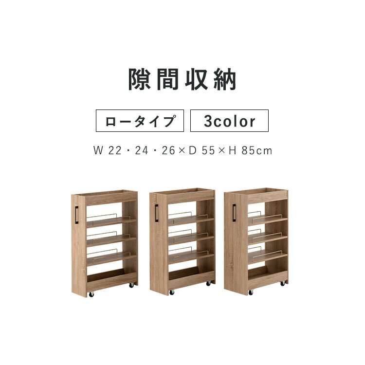 お部屋のちょっと余った隙間を収納スペースに変えられる、ロータイプのラックです。天板まで物が置けるので、収納をより有効活用できます。上下各1段の棚が可動式になっており、収納したい物の高さに合わせて1.6cm間隔で高さが調整可能。キャスター付きで、取り出す際も取っ手を持ってすぐに引き出せます。また、小物などが飛び出さない様に転び止め付きで安心。水や湿気に強い素材を使用しているので、キッチンや洗面所・トイレなどでも使用できます。★お客様組立★●商品サイズ(cm)26cm:幅約26×奥行約55×高さ約8524cm:幅約24×奥行約55×高さ約8522cm:幅約22×奥行約55×高さ約85●商品重量26cm:約13kg24cm:約12.1kg22cm:約11.5kg●材質板材:オールPVC(MDF)キャスター:ポリプロピレン●組立時間めやす約1時間(検索用:隙間ラック ショート すきま収納 スリムラック スペース活用 幅2センチ間隔 キッチン デスクサイド キャスター付き ランドリー ) 最強翌日配送対象商品に関するご案内 最強翌日配送対象商品・対象地域に該当する場合は最強翌日配送マークがご注文カゴ近くに表示されます。 最強翌日配送可能なお支払方法は【クレジットカード、代金引換、全額ポイント支払い】のみとなります。 下記の場合は最強翌日配送対象外となります。 ・15点以上ご購入いただいた場合 ・時間指定がある場合 ・ご注文時備考欄にご記入がある場合 ・決済処理にお時間を頂戴する場合 ・郵便番号や住所に誤りがある場合 ・最強翌日配送対象外の商品とご一緒にご注文いただいた場合 ・お届け先住所文字数が40文字以上の場合こちらはロータイプ 幅22・24・26cmのページです
