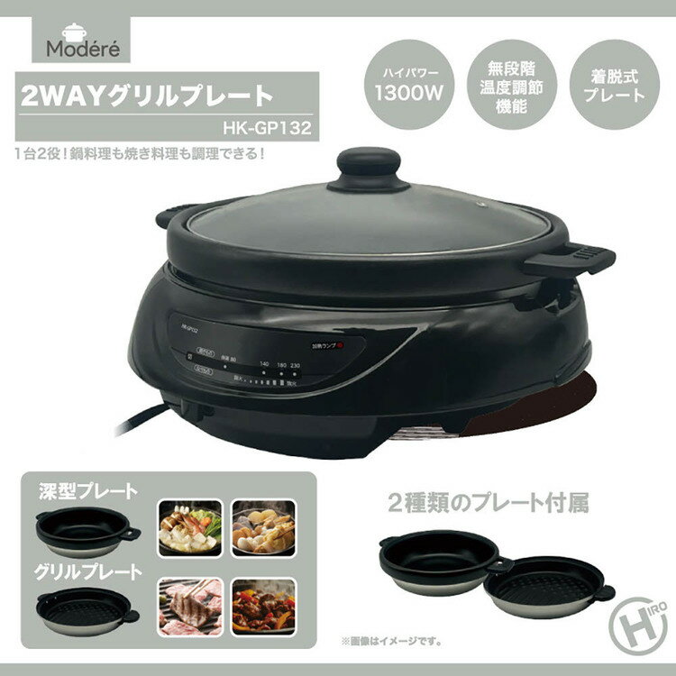 グリルなべ ホットプレート 着脱プレート 2WAYグリルプレート HK-GP1322WAYグリルプレート 1台2役 着脱プレート 鍋料理 焼き料理 ハイパワー1300W 無段階温度調節機能 着脱プレート 深鍋プレート グリルプレート