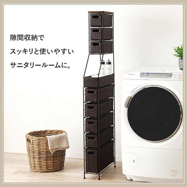 ※配送不可地域:北海道・沖縄県・離島・一部山岳地帯※特殊地域、配送不能区域など、発送方法に関してはメーカーより確認のご連絡をさせていただきます。予めご了承ください。※こちらの商品はお取り寄せ商品のため、初期不良以外の返品・交換は承れませんので、あらかじめご了承ください。隙間におけるスリムなラタン調収納ラック。ハイタイプで引出しが多く、使用頻度によって使い分けができます。●商品サイズ(cm)幅約15×奥行約45×高さ約154●商品重量約11kg●材質フレーム:スチール、本体:ポリエチレン(検索用:スリムラック すき間収納 ランドリー 収納 洗面台 コンパクト 薄型 防水 脱衣所 サニタリー 4934257333443 4934257333436 4934257333429)最強翌日配送対象商品に関するご案内 最強翌日配送対象商品・対象地域に該当する場合は最強翌日配送マークがご注文カゴ近くに表示されます。 最強翌日配送可能なお支払方法は【クレジットカード、代金引換、全額ポイント支払い】のみとなります。 下記の場合は最強翌日配送対象外となります。 ・15点以上ご購入いただいた場合 ・時間指定がある場合 ・ご注文時備考欄にご記入がある場合 ・決済処理にお時間を頂戴する場合 ・郵便番号や住所に誤りがある場合 ・最強翌日配送対象外の商品とご一緒にご注文いただいた場合 ・お届け先住所文字数が40文字以上の場合