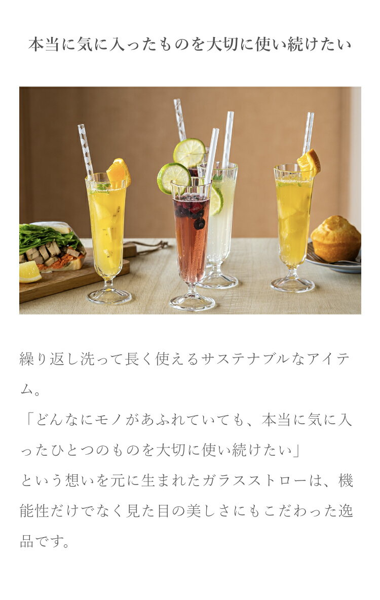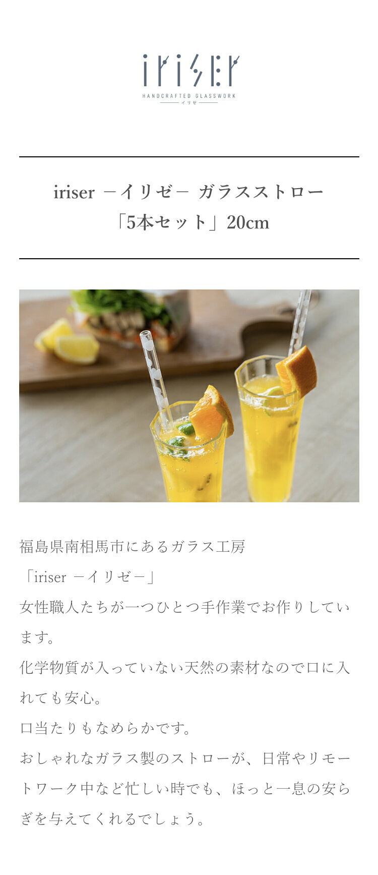 iriser ガラスストロー 5本セット 20cm マイストロー エコ ECO おしゃれ 日本製 ギフト プレゼント ブランド iriser 生産国 日本 生産地 福島県 窯元 アトリエ iriser ーイリゼー サイズ 直径:約0.8cm 高さ:約20cm 厚さ:約1.5mm 材質 耐熱ガラス ※ハンドメイドの為、個体差がございます。ご了承くださいませ。 ※お子様など、ガラス製品を口にすることに不安を感じる際は、ストローの口先に付属のシリコンチューブを着けてご利用ください。 ※ガラス製のため、ぶつけたり、落としたりすると割れてしまう可能性がございます。ご使用の際は丁寧にお取り扱いください。 ※ストローは、割れた場合の修理はいたしかねます。ご了承ください。 ※化粧箱にお入れしてお届けいたします。 どんなにモノがあふれていても、本当に気に入った1つのものを大切に使い続けたい。 福島県南相馬市の女性ガラス職人たちが、そんな想いで、1本ずつ手加工で製作しました。 化学物質が入っていない天然の素材ですので、口に入れても安心。 口当たりもなめらかです。 汚れも見えやすく、付属の洗浄ブラシで洗浄できるので衛生的です。 食洗器や電子レンジでのご使用も可能です。
