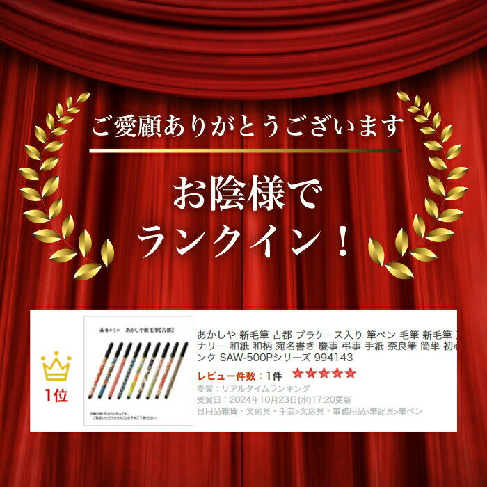 書き味絶妙な華やかな和柄の本格毛筆ペン ・楷書・行書が書きやすい。年賀状・宛名書き・のし書きなどに最適な筆ペン ・華やかな和紙を使用した筆ペンですので、祝い事のご芳名帳の記帳やプレゼントにも最適 ・コシの強い人造毛を使用しており、ハネ、トメ、ハライが美しく表現できます ・1本1本手づくりした本格派毛筆タイプの筆ペンです ・軸の色合いは黒・白・桃・黄・緑からお選び頂けます ※柄をお選び頂くことはできませんので、予めご了承下さい※ あかしや新毛筆 商品詳細 商品サイズ 外寸 :縦175m×横15mm×厚み15mm 筆ペン:直径10mm×176mm 重さ :14g 内容品 ・あかしや新毛筆 古都 1本 おすすめ ・手軽に毛筆を楽しみたい方 ・何か新しい趣味を始めたいと思っている方 ・字がきれいになりたい方 ・冠婚葬祭などの宛名書き ・お祝い事のお返しやプレゼントに 神宮館縁堂 楽天市場店では、金運アップ、厄除け(魔除け)商品等多く取り扱っております。 【関連商品キーワード】 神宮館 暦 こよみ 筆ペン 毛筆 写経 和柄 日本文化 カラフル あかしや 新毛筆 古都 手作り 奈良筆 友禅柄 手紙 楷書 書初め 宛名書き のし書き 結婚式 茶会 ご記帳 冠婚葬祭 ギフト プレゼント 縁起物 開運 正月 ご祝儀袋 不祝儀袋軸の色は黒・白・桃・黄・緑の5種類からお選びいただけます。 ※ただし軸の柄をお選びいただくことは出来ませんので、予めご了承下さい。