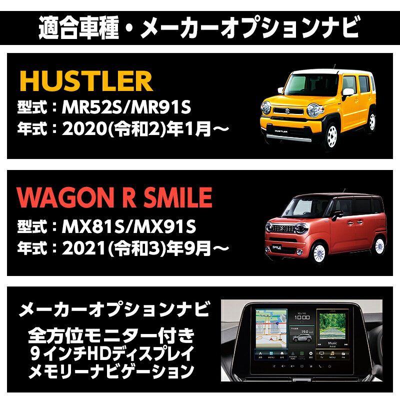 走行中でもTVが見れるので移動中も快適に過ごせます!!この商品はスズキ ハスラー ワゴンRスマイル メーカーオプション 全方位モニター付 9インチナビ 対応 TVキャンセラーポイント走行中でもTVを見れる! 長距離ドライブ時や渋滞中にお子様や、他の同乗車がテレビや動画を見ることができ、移動中も快適に過ごせます!!カプラーオンで取付け簡単! 取付けはすべての配線先にコネクターが付いている完全カプラーオンなので、純正の配線を傷つけることなく、簡単にお取付が可能です。しかも純正状態に復帰も簡単! ■■■走行中ナビ操作が可能に!製品はこちらからお買い求め下さい↓■■■ 【対応車種/ナビ】 車種:ハスラー 型式:MR52S/MR91S 年式:2020(令和2)年1月〜 メーカーオプションナビ:全方位モニター付き9インチHDディスプレイメモリーナビゲーション 車種:ワゴンRスマイル 型式:MX81S/MX91S 年式:2021(令和3)年9月〜 メーカーオプションナビ:全方位モニター付き9インチHDディスプレイメモリーナビゲーションショップからのメッセージ スズキ ハスラー ワゴンRスマイルのメーカーオプションのナビに対応したTVキャンセラーキット商品がついに登場! 走行中にテレビや動画が見れるハーネスキットです。商品はナビ裏に取り付けるカプラーオン! 【機能説明】 ・当製品を取付ると、走行中でも、常時TVが見れる状態になります。 ・目的地を設定していた場合、TVを視聴しながらでもナビ案内がされます。ナビ案内時になるたびに、TV画面からナビ画面に変りますが、 ナビゲージョンの画面の割り込み設定を変更することで、走行中TV視聴中、ナビ案内時でもTV視聴の画面のままナビ案内がされます。 ・TVキャンセラー(製品)の機能のON/OFFはありません。切り替えスイッチもございません。商品取付後は、常時走行中でもTVが視聴できる様になります。 【商品内容】 ・TVキャンセラー配線キット・簡易取付説明書(汎用の説明書になりますので、詳細な取り付けの説明及び、取り付け動画はございません。) 【製品についての注意事項】 ・当製品を取り付けても、走行中にナビ操作ができません。(走行中ナビ操作が可能になる商品S-TV-02(上部にリンクあり)も合わせてご購入下さい) ・同乗車用の視聴を対象とした製品です。運転者は走行中に視聴しないで下さい。・製品を取付けても、問題なく車検に適合します。 ・本製品はTVチューナーではございません。 ・ナビにオプションのDVD機能がついていない場合は走行中DVD視聴はできません。 ※今後、ナビのアップデートなどにより、製品が機能しなくなる可能性がございます。(2024/06/17記入)【ディーラーオプションナビの方】 ディーラーオプションナビへのお取り付けの場合は、下記の商品ページよりお買い求めください。 ナビの型番をご確認いただき対応しているかご確認下さい。ディーラーオプションの場合のTV(ナビ)キャンセラーはこちら