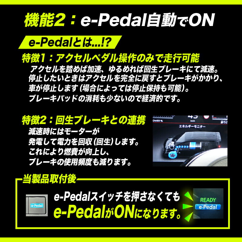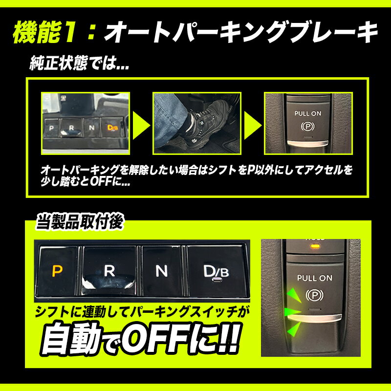 この商品はニッサン セレナC28 対応 オートパーキングブレーキ&オートeペダル&バックハザード 3大機能キット■Pシフト以外でパーキングブレーキが自動で解除!■e-PedalがエンジンONで自動でON!■シフトをRに入れるとバック動作中にハザードが連動して点滅!■機能ごとに切り替えができ、全機能を一気に切り替えることもできます! ショップからのメッセージ日産セレナC28に対応したオートパーキングブレーキ&オートeペダル&バック連動ハザードの3つの機能がついたキットが登場!Pシフト以外でパーキングブレーキが自動で解除できたり、e-PedalがエンジンONで自動でONになったり、シフトをRに入れるとバック動作中にハザードが連動して点滅します!機能の切り替えも機能ごとに切り替えと、全機能を一気に切り替えることもでき大変便利なキットとなっております!【対応車種】ニッサン セレナ C28型式:C28/GC28/GFC28/SFNC28(SNC28は未確認)年式:2022年(令和4)年12月~グレード:全グレード【機能説明】■オートパーキングブレーキ解除純正状態ではシフトをP以外にいれて、アクセルを軽く踏むとパーキングブレーキが解除されて車を発進することができますが、本製品を取り付けることによって「シフトをP以外にいれる」だけでパーキングブレーキが解除されて車を発進することができます。駐車場や狭い場所だとアクセルを踏んで発進することに対抗があり怖いと感じる事も、ブレーキを離すだけで自然にゆっくり動き出すクリープ現象での発進が可能になります。※オートパーキングはブレーキホールド機能を使用されていると、シフトをPに入れれば自動的にONの状態となります。こちらは純正の仕様です。■オートeペダルそもそもe-Pedal機能とは・・・アクセルを踏んだ後、アクセル戻し始めたところから回生ブレーキが働き、ワンペダルでアクセルの加減ができる機能です。基本的には足の位置をアクセル位置にとどめたままになり、アクセルペダルの離し具合、踏み具合で加減し、ブレーキペダルへの踏み替えが減り、とても便利です。そんなe-Pedal機能を製品を取り付ける事によってエンジンONに連動して自動でONにする事ができます。■バック連動ハザードシフトをRに入れると連動してハザードが点滅します。駐車するときいちいちボタンを押すのは面倒ですがこれがあればとても楽に駐車できます。シフトをR以外に切り替えるとハザード点滅は止まります。【機能切替方法】切り替えたい機能に合わせてシフト操作をしてください。シフト操作後、ハザードが3回点滅で機能ON、ハザードが1回点滅で機能OFFになります。■オートパーキングブレーキ解除・P→D→P→D→P→D→P■オートeペダル・P→N→P→N→P→N→P■バック連動ハザード・P→R→P→R→P→R→P【全機能一括切替方法】ハザードボタン2回押して、2回目を5秒以上を押すと全ての機能のON/OFFの切り替えが可能です。※全機能OFFから全機能ONに戻す場合は、元の設定が保持されます。【商品内容】・配線キット ・簡易説明書
