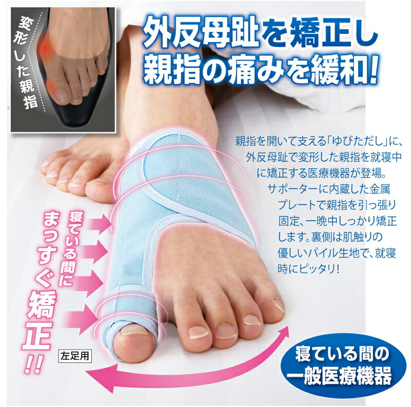 メール便での配達ですので一読ください。 寝ている間に外反母趾を矯正し親指の痛みを緩和。親指を開いて支える「ゆびただし」に、外反母趾で変形した親指を就寝中に矯正する医療機器が登場。サポーターに内蔵した金属プレートで親指を引っ張り固定、一晩中しっかり矯正します。裏側は肌触りの優しいパイル生地で、就寝時にピッタリ。 ■素材/本体:ナイロン、綿、ポリエステル プレート:アルミニウム ■適応目安サイズ(約)/22.5〜25cm ■日本製 ■右足用と左足用からお選びください ■一般医療機器届出番号/11B3X10017000021