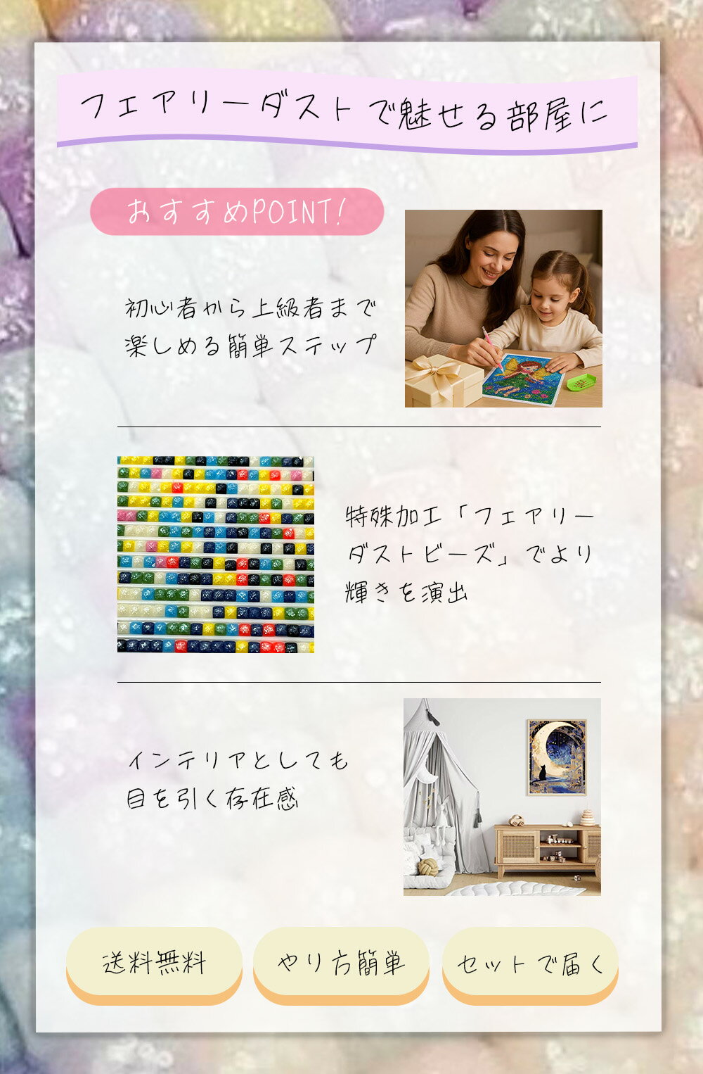★こちらは当店の新商品 ALLフェアリーダストビーズ ダイヤモンドアート ◆フェアリーダストビーズとは 樹脂ビーズの表面にレーザープロセスを施し、きらびやかな色を表現したオリジナルのビーズです。 こちらは珍しいALL フェアリーダストビーズダイヤモンドアート 全てのビーズはフェアリーダストビーズになっています ———————————————————————— ◆在庫は限りがあります。 早い者勝ちです。 ◆ 商品内容 サイズ A3サイズ(29.7×42cm) ストーン スクエアフェアリーダストビーズ ストーンは図案の全体にのせます。 ビーズの種類は確認済み。 ◆【セット内容】 1、貼り付けタイプ台紙 2、スクエアフェアリーダストビーズ 3、グルー(ピンクの糊) 4、専用ペン 5、トレー 6、ピンセット 7、収納用チャック付きポリ袋 全ての付属品が揃っていますので届いたその日からすぐに作成出来ます。 ★注意点★ ・シートが輸送時よりシワがありますが作品をつくるのに支障はありません、ご理解いただける方のみご購入お願いします ・額はキットに含まれません、別途ご用意下さい。 ・手芸キットは海外産ですご了承の上購入をお願いします。 ・出品は売れてしまっても再入荷出来ます。 時間は3週間かけるの事をご了承の上にコメントから連絡お願いします。初心者OK!光に輝くフェアリービーズ使用。A3サイズの幻想アートキット。