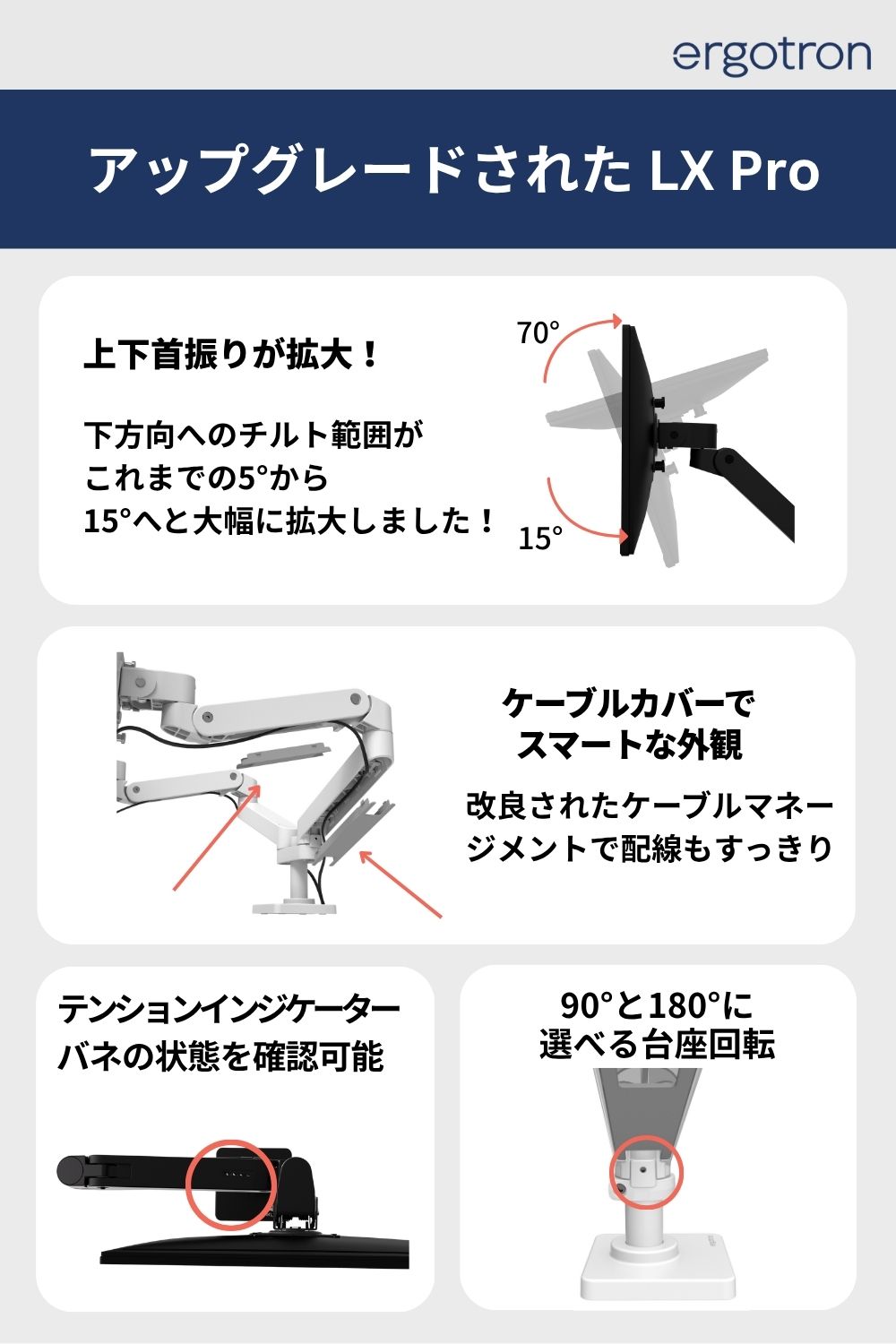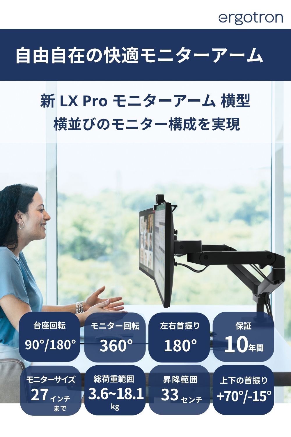 カラーバリエーション ブラック 45-686-292 商品詳細 LX Proは、従来のLXモニターアームの良さを引き継ぎながら、アップグレードされたモニターアームです。 可動域が広く、モニターの位置、角度、高さの調節が軽い力で自由自在。快適な目線と姿勢で疲れを軽減します。 経年劣化がないエルゴトロン独自のコンスタント・フォース技術はLX Proにも搭載されており、長くご愛用いただけます。 横並び配列のデュアルモニター環境にぴったりなモニターアームです。使用しないときはコンパクトに折りたため、デスクを広く使えます。 新しく追加された機能ローテーションストップで台座部分の回転関節を90°と180°に変更することができ、壁などへの衝突を防ぎます。 新しく追加された機能テンションインジケーターで、昇降関節をつかさどるバネの調整状態を目視確認できます。 豊富なアクセサリでさまざまなカスタマイズが可能です。ベースを取り換えてアームを付け足すことで3画面、4画面などのマルチモニター構成が可能になります 。 従来のLXデュアル横型より軽いモニターに対応、27インチまで、1モニター1.8kgから9kgまで/総重量3.6kgから18.1kgまでのモニターに対応、VESA 100x100mm、75x75mmです。 チルト範囲も従来のLXより10°拡大され、上方向70°/下方向15°になりました。 ケーブルカバーを追加することでケーブルマネージメントが改良され、ケーブルがすっきり簡単にまとまります。 部品を少なくし、簡単組み立て・設置を実現しました。 天板を挟んで取り付けるクランプで取り付け。クランプは60mmまでの厚さに取り付けできます。 耐久性と安定性に優れ、保証期間は安心の10年です。 取扱説明書に従い組み立て、モニターを取り付けてから各部の調整を行ってください。組み立て前の状態では各部の調整はできません。 LX Proアーム2本、エクステンション2本、モニターピボット2個、デスククランプ、標準ベース、ポール、Tブラケット、ポールカラー、取り付け金具が梱包されています。製品本体重量約6.2kg。 ホワイト、ブラックの2色展開。 ご注意(免責)>必ずお読みください 取扱説明書をお読みの上、正しくお使いください。 モニターを取り付けてから各部の調整を行ってください。組み立て前の状態では各部の調整はできません。 グロメットマウントは別売 (98-728-290) です。 製品ご購入後のお客様のサポート窓口 japansupport@ergotron.com (日本語) ご使用中何かご不明点がございましたら、こちらのサポート窓口へお問い合わせください。 アクセサリー グロメットマウントベース ホワイト 98-728-290 ノートブックトレー 50-193-200 キーワード ERGOTRON エルゴトロン モニターアーム LX LX Pro LXプロ プロ デスクマウント デュアル 横型 横並び 2画面 3画面 4画面 マルチモニター ディスプレイマウント モニターマウント VESA アップグレード 追加機能 新機能 新製品