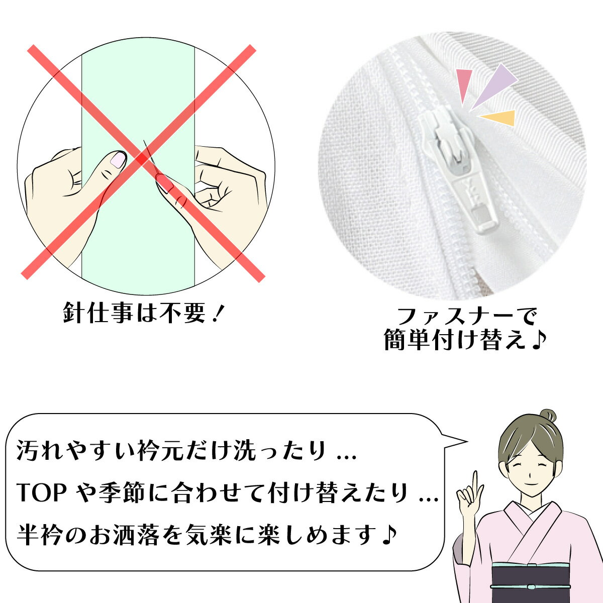 ショップトップはこちら き楽っくはこちら 替え衿はこちら 替え袖はこちらファスナーを閉じればそれだけで半衿付けは終了!き楽っく専用替え衿 ファスナーで簡単に半衿の脱着が出来る襦袢「き楽っく」専用の替え衿です。 地紋様入りの替え衿です。 塩瀬とはまた違う、さりげない衿元のお洒落を演出します。 ◆◆◆カラーをお選びください◆◆◆ ↑カラー【市松】↑ ↑カラー【さやがた】↑ ↑カラー【小桜】↑ ↑カラー【疋田】↑ ↑カラー【吹雪】↑ ↑カラー【麻の葉】↑ ↑カラー【たて枠】↑ ↑カラー【七宝】↑ ファスナー式の替え衿とは? お襦袢の衿元と半衿部分がファスナーで取り外しできる画期的な襦袢です。 針で半衿を縫い付ける手間から解放され、10秒で半衿が取り付けられます。 ファスナーは直接肌に当たらず、やわらかいナイロンファスナー(YKK)を使用しておりますので身体にストレスはありません。 外見からファスナーが見えないようになっておりますので一般のお襦袢と同じように使っていただけます。 この便利さを是非お試しください。 素材 【半衿】ポリエステル100%【ファスナー】ナイロン 洗濯方法 ご自宅の洗濯機で洗っていただけます。 備考 本商品は、【き楽っく】専用の替え衿です。 全ローズカラー製品にお使いいただけます(※)が、類似品にはご注意ください。 (※)廃盤になっておりますアルミ素材のファスナーとは相互性がございません。製造元 株式会社 衿秀日本製
