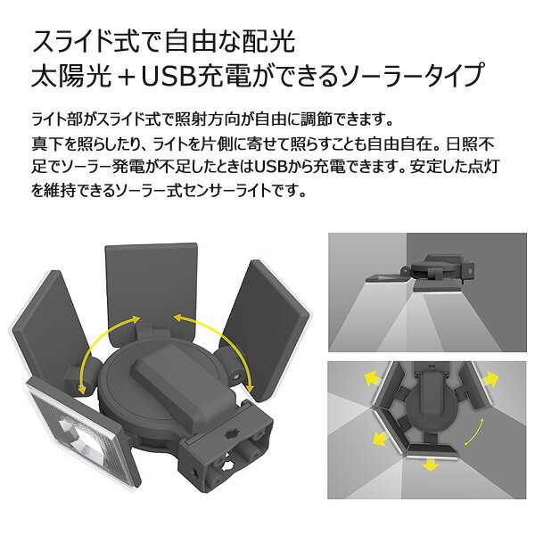 ムサシ musashi S-400L LEDセンサーライト 7.5Wx4灯 スライド型 ソーラー式 USB充電 明るさ2400ルーメン S400L「送料無料」