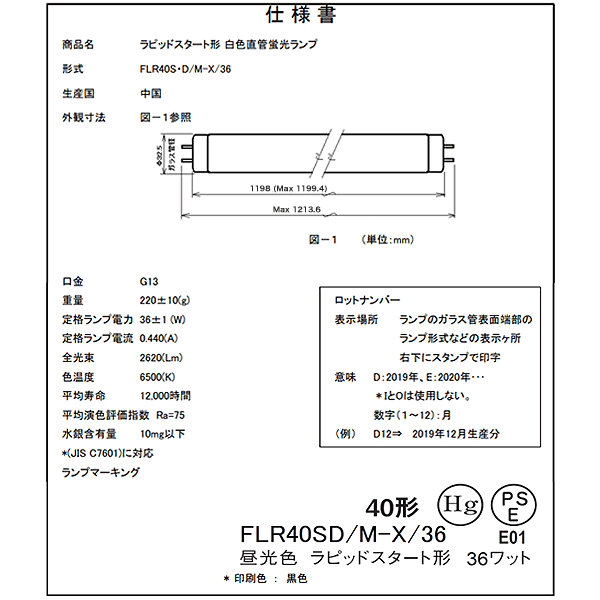 商品の詳細 ●25本セット 送料無料! ●ラピッドスタート形 昼光色直管蛍光ランプ FLR40S・D/M-X/36 昼光色 40形 36ワット Private Brand PB ラピッドスタート 昼光色 昼光色蛍光ランプ (D) 昼光色 D: 少し青みがかった光色。 涼しげな雰囲気を演出します! ●直管ラピッドスタート 形 ●区分:40形 36ワット ●品名: FLR40S・D/M-X/36 ●光源色(光色):昼光色 ●色温度(K):6500 ●演色評価数:Ra75 ●口金:G13 ●寸法(mm):管径32.5 管長1,198 ●質量(g):230 ●定格ランプ電力(W):36 ●全光束(lm):2,620 ●ランプ電流(A):0.440 ●寿命(時間):12,000 ※品番:FLR40SDM36・・・FLR40SDMX36・・・全商品と互換性がございます。 お気軽にお問い合わせ下さい! 代替品(同等品):パナソニック FLR40SDMX36 ハイライト FLR40S・D/M-X・36 パナソニック FLR40SDMX36RF3 FLR40S・D/M-X・36RF3 ハイライト パナソニック FLR40SDMX36 FLR40S・D/M-X・36 ハイライト 東芝 FLR40SD/M/36 三菱 FLR40SD/M/36 FLR40SDM36 日立 FLR40SD/M/36-B サンライン FLR40SDM36B NEC FLR40SD/M/36 ライフラインII ホタルクス FLR40SD/M/36 FLR40SDM36 ※沖縄・離島一部指定地域への配送は別途お見積りとなります。 是非お気軽にお問合せ下さい! 関連商品:flr40sd/m/36 flr40sdm36 flr40sdmx36 flr40s・d/m-x・36 flr40sdmx36rf3 flr40s・d/m-x・36rf3 flr40sdmx36 flr40s・d/m-x・36 flr40sd/m/36-b flr40sdm36b ※蛍光灯、27年末で製造禁止へ。 2023年11月3日、スイスジュネーブ会議において、直管蛍光灯の製造と輸出入を2027年末までに禁止することなどで合意。 2025年末での製造・輸出入禁止が既に決まっている、電球形蛍光灯と合わせ、 全ての一般照明用蛍光灯の製造が2027年終了となります。 詳しくは弊社までお気軽にお問合せご相談下さい!