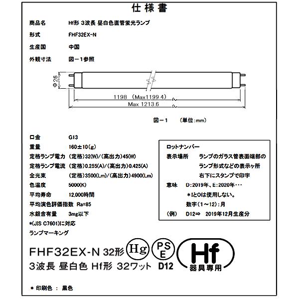 商品の詳細 ※2024年6月1日 大幅価格改定 対象商品! 予めご理解とご協力の程宜しくお願い申し上げます。 ●25本セット 送料無料! ●Hf32形 直管蛍光ランプ FHF32EX-N-H 3波長形昼白色(ナチュラル色) 32ワット Private Brand PB Hf蛍光ランプ 高周波点灯専用 高周波点灯専用の直管蛍光ランプ。 専用器具との組み合わせでスタータ形やラピッドスタート形と比べて 効率が向上!省エネルギーを実現。 器具により定格点灯と高出力点灯の2通りが可能。 25.5mmのスリムな管径。 ●直管Hf形(〔Hf〕器具専用) ●種別:32形 ●形名: FHF32EX-N-H ●光色:3波長昼白色(ナチュラル色) ●色温度:5000K ●外形寸法(mm):長さ 1198±4 ガラス管の径 25.5±5 ●質量(g):160 ●口金:G13 ●定格ランプ電力(W):32/45 ●ランプ電流(A):0.255/0.425 ●全光束(lm):3500/4900 ●定格寿命(h):12000 ●平均演色評価数(Ra):85 ※品番:FHF32EX-N・・・全商品と互換性がございます。 お気軽にお問い合わせ下さい! 同等品(代替品):ホタルクス FHF32EX-N-HX-S ライフルックHGX FHF32EXNHXS ホタルクス FHF32EX-N-HX2 ライフルックHGX FHF32EXNHX2 NEC FHF32EX-N-HX-S ライフルックHGX FHF32EXNHXS NEC FHF32EX-N-HX ライフルックHGX FHF32EXNHX パナソニック FHF32EXNHF3D Hf蛍光灯 パルック FHF32EX-N-HF3D (ランプ本体品番:FHF32EX-N-H) FHF32EXNHF2D FHF32EX-N-HF2D FHF32EXNHF225K FHF32EX-N-HF2/25K FHF32EXNHF325K FHF32EX-N-HF3/25K FL0328318 FHF32EXN FL0328318S FHF32EXN25K簡易包装 東芝 FHF32EX-N-H メロウライン FHF32EXNH 三菱 FHF32EX-N-H ルピカライン FHF32EXNH 三菱 FHF32EX-N-H・25P ルピカライン FHF32EXNH25P 日立 FHF32EX-N-K ハイルミック昼白色 FHF32EXNK ※沖縄・離島一部指定地域への配送は別途送料お見積りとなります。 是非お気軽にお問合せ下さい! 関連商品:fhf32ex-n-hx fhf32exnhx fhf32ex-n-hx-s fhf32exnhxs fhf32ex-n-hx2 fhf32exnhx2 fhf32exnhf3d fhf32ex-n-hf3d fhf32exnhf2d fhf32ex-n-hf2d fhf32exnhf225k fhf32ex-n-hf2/25k fhf32exnhf325k fhf32ex-n-hf3/25k fl0328318 fhf32exn fl0328318s fhf32exn25k簡易包装 fhf32ex-n-h fhf32exnh 三菱 fhf32ex-n-h・25p fhf32exnh25p fhf32ex-n-k fhf32exnk ※蛍光灯、27年末で製造禁止へ。 2023年11月3日、スイスジュネーブ会議において、直管蛍光灯の製造と輸出入を2027年末までに禁止することなどで合意。 2025年末での製造・輸出入禁止が既に決まっている、電球形蛍光灯と合わせ、 全ての一般照明用蛍光灯の製造が2027年終了となります。 詳しくは弊社までお気軽にお問合せご相談下さい!