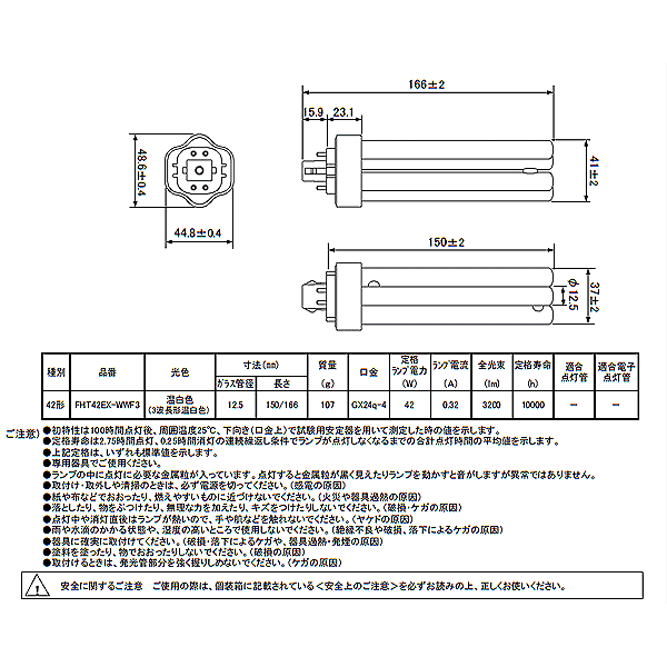 商品の詳細 ●5個セット 送料無料! ●パナソニック FHT42EX-WWF3 コンパクト蛍光灯 42形 42W 3波長形 温白色 FHT42EXWWF3 Panasonic パナソニック パナソニック株式会社 エレクトリックワークス社 ライティング事業部 ●メーカー:パナソニック ●品名:ツイン蛍光灯 ・スリムなガラス管をブリッジ技術で結合させた蛍光灯。 ツイン蛍光灯■ツイン3(6本束状ブリッジ) ●種別:42形 ●品番:FHT42EX-WWF3 ●光色:温白色(3波長温白色) ●色温度:3500K ●寸法(mm):ガラス管径 12.5 長さ 150/166 ●質量(g):107 ●口金:GX24q-4 ●定格ランプ電力(W):42 ●ランプ電流(A):0.32 ●全光束(lm):3200 ●色温度(K):3000 ●定格寿命(h):10000 ●標準梱包:10×1 ・御注文品番:FHT42EX-WWF3 ・POSコード(下6桁):596326 (JAN:4549980596326) ※品番:FHT42EX-WW・・・全商品と互換性がございます。 詳しくは是非お気軽にお問い合わせ下さい! ※沖縄・離島一部指定地域への配送は別途送料お見積りとなります。 是非お気軽にお問合せ下さい! 関連商品: 東芝 FHT42EXWW ユーライン3 FHT42EXWWK FHT42EXWWK2 FHT42EXWWTS 三菱 FHT42EXWW BB3 FHT42EXWWK FHT42EXWWFA FHT42EXWWFAA 日立 FHT42EXWWB Hfパラライト3 FHT42EXWWC FHT42EXWWV FHT42EXWWVJ NEC FHT42EXWW キキ FHT42EXWWキキ Hfカプル3 ※蛍光灯、27年末で製造禁止へ。 2023年11月3日、スイスジュネーブ会議において、直管蛍光灯の製造と輸出入を2027年末までに禁止することなどで合意。 2025年末での製造・輸出入禁止が既に決まっている、電球形蛍光灯と合わせ、 全ての一般照明用蛍光灯の製造が2027年終了となります。 詳しくは弊社までお気軽にお問合せご相談下さい!