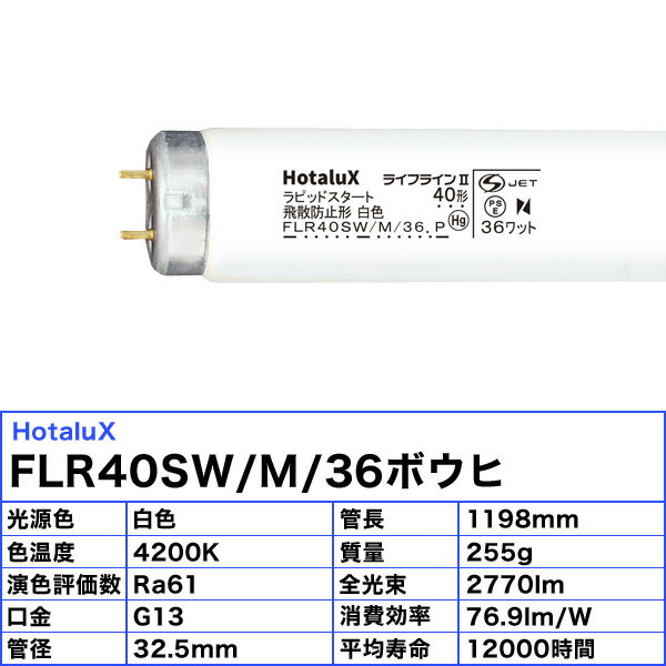 関連商品はこちらです。 単品 10本セット 50本セット 商品の詳細 ●50本セット 送料無料! HotaluX 株式会社ホタルクス 飛散防止形 大きさの区分:40形 品名:FLR40SW/M/36ホ゛ウヒ ●光源色:白色 ●色温度:4200K ●演色評価数:Ra61 ●口金:G13 ●寸法:管径32.5 管長1,198mm ●質量:255g ●定格ランプ電力:36W ●全光束:2770lm ●消費効率:76.9lm/W ●ランプ電流:0.44A ●定格平均寿命:12,000時間 ●JANコード:4904323609086 ●商品コード:06113355 ※沖縄・離島一部指定地域への配送は別途お見積りとなります。 こちらも、是非お気軽にお問合せ下さい! ※蛍光灯、27年末で製造禁止へ。 2023年11月3日、スイスジュネーブ会議において、直管蛍光灯の製造と輸出入を2027年末までに禁止することなどで合意。 2025年末での製造・輸出入禁止が既に決まっている、電球形蛍光灯と合わせ、 全ての一般照明用蛍光灯の製造が2027年終了となります。 詳しくは弊社までお気軽にお問合せご相談下さい!