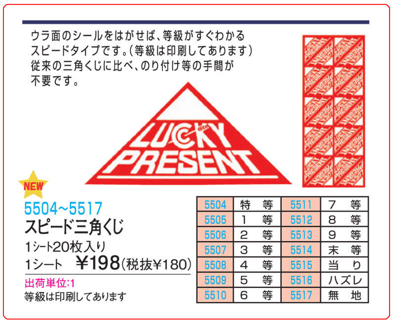 商品名 スピード三角くじ(等級入り) 20枚セット♪ サイズ 1枚:7cm×7cm、シート:32cm x 14cm 種類内容 無地、ハズレ、当り、末等、特等、1等、2等、3等~9等 ・同一内容の20枚セットですので、ご注文時に必ず内容をご指示ください。・やはりイベントの主役はくじ!・使用方法 ウラ面のシールをはがせば等級がすぐわかるスピードタイプです(等級は印刷してあります)。 ・従来の三角くじに比べ、のり付けの手間が不要! 材 質 紙 送料について ・この商品はメール便にはできません。通常の宅配便でのお届けとなります。 ・この商品の送料は990円となります。・店舗・イベント用品のカテゴリーから合計2000円以上お買上げの場合は通常の送料550円に訂正させて頂きます!▼スピード三角くじ(等級入り) 20枚セット▼