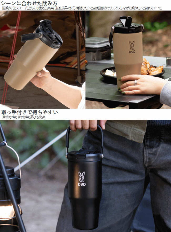 【14日20時〜最大3,500円クーポン+最大P47倍】DOD タンブラー 真空断熱タンブラー 直飲み式 ストロー式 2WAY仕様 真空断熱構造 大容量 取っ手付き 2段ロック構造 漏れにくく衛生的 アウトドア キャンプ BK ブラック TN タン トッテモ・ウサーモ MG1-159