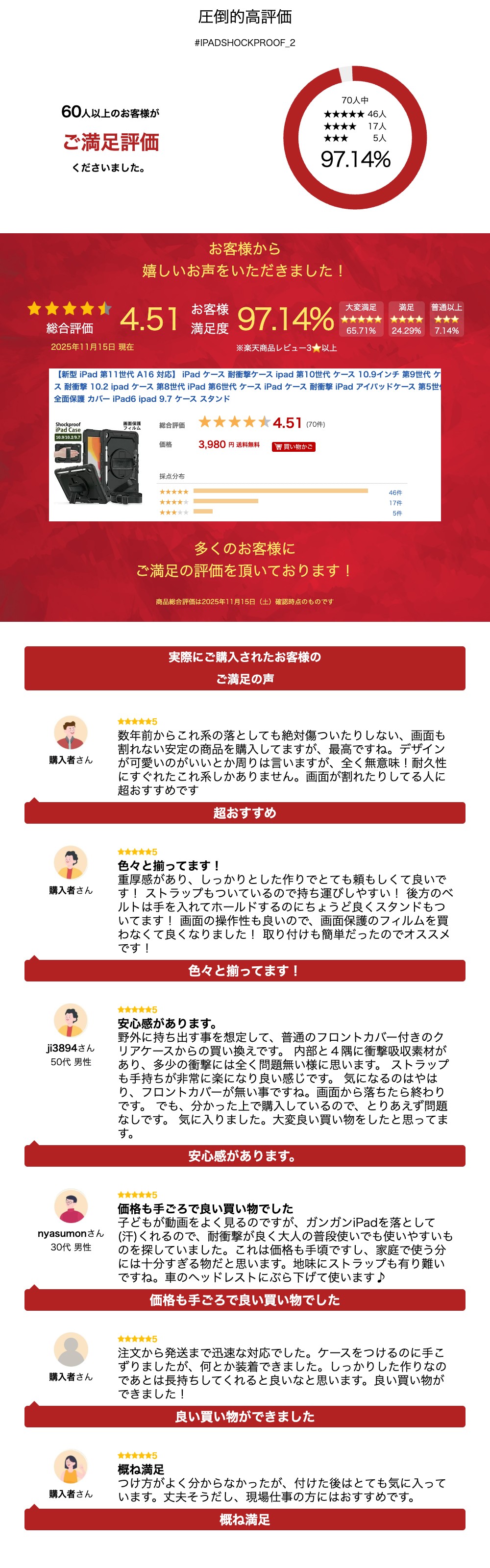 \2022 iPad (第10世代)用も絶賛発売中♪/ 2022 10.9インチ iPad10 ケース/iPad (第 10 世代) 2021 10.2インチ iPad9 ケース/iPad (第 9 世代) 2020 10.2インチ iPad8 ケース/iPad (第 8 世代) 2019 10.2インチ iPad7 ケース/iPad (第 7 世代) 2018 9.7インチ iPad6 ケース/iPad (第 6 世代) 2017 9.7インチ iPad5 ケース/iPad (第 5 世代) 耐衝撃 iPad 保護カバー/ケース スタンド機能・ショルダーストラップ(ネックストラップ) SHOCKPROOF.(ショックプルーフ。) \iPad ケース 耐衝撃タイプ/ ■主な特徴: 【1】耐衝撃性能 【2】スタンド機能付き 【3】ショルダーストラップ(ネックストラップ)付き ▼ 商品紹介 落下試験済の耐衝撃性 ●衝撃吸収層(シリコン)と保護層(ハードPC)でダブルプロテクト! ●ディスプレイの外側のガードも加えた3層構造で、あなたのiPadを守ります。 ※液晶画面保護フィルムは、別売りです。 接続部を保護 ●イヤホンジャックなどの接続部は、使わないときは蓋を閉じてほこりや水からもガード! 収納式スタンド ●自立スタンド用の脚をスライドさせて、持ち出すとiPadが自立(ハンズフリー)してお使いいただけます。 ※自立スタンド用の脚の角度調整:無し(1段階) ストラップ付属 ●ショルダーストラップ(ネックストラップ)付き! ※調整可能な範囲(ストラップ長さ): 1m?1.5m ●iPadケース側へはワンタッチクリップでストラップの取り付けが可能。 ●各種イベント・店頭業務、通勤・移動時、車載用など、使用用途が多種多様に拡がります! iPad専用設計 ●iPadケースを装着したまま、充電ができます。 ●カメラもカバーし、しっかりと保護してくれます。 ●イヤホンもiPadケースを装着したまま、ご使用いただけます。 ※iPadのモデルや、入荷時期によって仕様が異なる場合がございます。 ▼ 関連商品 ●新しいiPadケースは >> こちら ●タッチペンは >> こちら ●360度回転ケースは >> こちら ●スマートカバー[PIXEL.]は >> こちら ●ソフトエッジタイプ[AQUA.]は >> こちら ▼ 対応機種】iPad A16 11インチ / iPad 10.9インチ(2022) iPad (A16) 発売年:2025 年▼ モデル番号 (背面カバー) ●iPad(A16):A3354、A3355、A3356 Apple iPad 第 10 世代 発売年:2022 年 「A14 Bionicチップ」を搭載した10.9型iPad ▼ モデル番号 (背面カバー) ●iPad(第10世代):A2696 ●iPad(第10世代) Wi-Fi + Cellular:A2757、A2777 キーワード:ipad 第10世代 ipad ケース 第10世代 ipad 10 ipad 10世代 ipad カバー 第10世代 ipad10 ipad10 ケース ipadケース 10世代 ipad 10世代 フィルム ipad 2022 ケース ipad 2022 ipad 第十世代 ipad ケース第十世代 ipad 10 ケース ipad 10 カバー アイパッド 第10世代 アイパッド ケース 第10世代 アイパッド 10 アイパッド 10世代 アイパッド カバー 第10世代 アイパッド10 アイパッド10 ケース アイパッドケース 10世代 アイパッド 10世代 フィルム アイパッド 2022 ケース アイパッド 2022 アイパッド 第十世代 アイパッド ケース第十世代 アイパッド 10 ケース アイパッド 10 カバー 新型 ipad 第10世代 ipad 10.9 インチ ケース アイパッド 第10世代 ケース アイパッド2022 ケース アイパッド 10.9インチ ケース ipad 10.9 インチ カバー アイパッド 第10世代 カバー アイパッド2022 カバー アイパッド 10.9インチ カバー ipad 10.9 アイパッド 10.9 ipad 10.9インチ アイパッド 10.9インチ アイパッド ケース ipad ケース アイパッド カバー ipad カバー ipad 第10世代 兼用 アイパッド 第10世代 兼用 ipad 子供 ケース 衝撃吸収 ipad 第10世代 カバー キッズ ipad ケース 子供用 タブレット ケース 子供 ▼ 対応機種】iPad 10.2インチ (2021/2020/2019) Apple iPad (第 9 世代) 発売年:2021 年 「A13 Bionic」を搭載した10.2型iPad ▼モデル番号 (背面カバー)▼ ●iPad (第 9 世代):A2602 ●iPad (第 9 世代) Wi-Fi + Cellular:A2604、A2603、A2605Apple iPad (第 8 世代) 発売年:2020 年 「A12 Bionic」を搭載した10.2型iPad ▼モデル番号 (背面カバー)▼ ●iPad (第 8 世代):A2270 ●iPad (第 8 世代) Wi-Fi + Cellular:A2428、A2429、A2430 Apple iPad (第 7 世代) 発売年:2019 年 10.2型タブレット「iPad」の第7世代モデル ▼モデル番号 (背面カバー)▼ ●iPad (第 7 世代) Wi-Fi:A2197 ●iPad (第 7 世代) Wi-Fi + Cellular:A2200、A2198 キーワード:ipad 第9世代 ipad ケース 第9世代 ipad 9 ipad 9世代 ipad カバー 第9世代 ipad9 ipad9 ケース ipadケース 9世代 ipad 9世代 フィルム ipad 2021 ケース ipad 2021 ipad 第九世代 ipad ケース第八世代 ipad 8 ケース ipad 8 カバー アイパッド 第8世代 アイパッド ケース 第8世代 アイパッド 8 アイパッド 8世代 アイパッド カバー 第8世代 アイパッド8 アイパッド8 ケース アイパッドケース 8世代 アイパッド 8世代 フィルム アイパッド 2021 ケース アイパッド アイパッド カバー ipad カバー ipad 第9世代 兼用 アイパッド 第9世代 兼用 ipad 子供 ケース 衝撃吸収 ipad 第8世代 カバー キッズ ipad ケース 子供用 タブレット ケース 子供 ▼ 対応機種】9.7兼用(2018/2017/Pro/Air2/Air) Apple iPad (第 6 世代) 発売年:2018 年 ▼モデル番号 (背面カバー)▼ ●iPad (第 6 世代) Wi-Fi:A1893、A1954 Apple iPad (第 5 世代) 発売年:2017 年 ▼モデル番号 (背面カバー)▼ ●iPad (第 5 世代) Wi-Fi:A1822、A1823 Apple iPad Pro 9.7 インチ 発売年:2016 年 ▼モデル