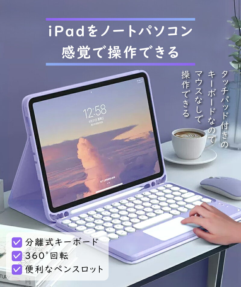 2022年秋モデルの10.9インチiPad [第10世代] 用 キーボード付きカバー/ケースiPad 2022 10.9ケース 2021年秋/2020年秋/2019年秋モデルの10.2インチiPad [第9/8/7世代] 用 キーボード付きカバー/ケースiPad 2021 10.2ケース / iPad 2020 10.2ケース / iPad 2019 10.2ケース2022年春モデルの10.9インチiPad Air [第5世代] 用 キーボード付きカバー/ケース2020年秋モデルの10.9インチiPad Air [第4世代] 用 キーボード付きカバー/ケースiPad Air 2020 10.9ケース ◆ スマートキーボード付き iPadケース/カバー ◆ \iPad Air(第5/4世代) 対応♪/\iPad (第 10 世代) 対応♪/ 2022/2020年発売の新しいiPad【10.9インチ iPad Air5/4】に対応しています。2022年秋発売の新しいiPad【10.9インチ iPad10】に対応しています。 ▼ 商品紹介 iPadの使い方広がる! キーボード付きのiPadケース 磁力でキーボードを固定!着脱簡単! ノートパソコン型iPadケース 専用ケースとキーボードでまるでノートパソコンのようにiPadを使えます 文章の作成・動画の視聴などオフィスでも自室でもiPadの活躍の幅が広がります 分離式キーボード キーボードは磁石で固定するため簡単に取り外すことができますキーボードを単独で使用することも可能です タッチパッド付 タッチパッド付キーボードなので、マウスの代わりに操作が可能です 360度回転式 iPadが360度回転するので、縦向きにも横向きにも置くことができます Apple Pencilケース シリコン製のケースにはApple Pencilを入れる専用のスペースがあります なくしやすいApple Pencilも安心してご一緒にご利用いただけます ▼ 商品仕様等 キーボードの自動変換について 「iPad OS 13.4」より、外部キーボード利用時には、自動的に変換を行う「ライブ変換」という日本語入力システムが利用可能になりました。 「ライブ変換」は、デフォルトでオンになっています。 「ライブ変換」が不要な場合には、iPadの設定から「ライブ変換」を「オフ」にしてください。 「設定」 ⇒ 「一般」 ⇒ 「キーボード」 ⇒ 「ハードウェアキーボード」」 ⇒ 「ライブ変換」 ▼ 商品保証 ●交換対象:キーボードの不具合など●保証期間:3ヶ月 ▼ 関連商品 ●iPad用ガラス保護フィルムは >> こちら ●新しいiPadケースは >> こちら ●スマートカバー[PIXEL.]は >> こちら ●ソフトエッジタイプ[AQUA.]は >> こちら ▼ 対応機種】iPad Air 11インチ(M3/M2)iPad Air M3 発売年:2025 年 「M3チップ」を搭載した11型iPad▼ モデル番号 (背面カバー) ●iPad Air 11インチ(M3):A3266、A3267、A3270iPad Air M2 発売年:2024 年 「M2チップ」を搭載した11型iPad▼ モデル番号 (背面カバー) ●iPad Air(第6世代):A2902 ●iPad Air(第6世代) Wi-Fi + Cellular:A2903、A2904 ▼ 対応機種】iPad A16 / 第10世代 iPad (A16) 発売年:2025 年▼ モデル番号 (背面カバー) ●iPad(A16):A3354、A3355、A3356Apple iPad (第 10 世代) 発売年:2022 年 「A14 Bionicチップ」を搭載した10.9型iPad ▼ モデル番号 (背面カバー) ●iPad(第10世代):A2696 ●iPad(第10世代) Wi-Fi + Cellular:A2757、A2777 ▼ 対応機種】10.2インチ iPad (第9/8/7世代)/iPad Pro 10.5インチ Apple iPad (第 9 世代) 発売年:2021 年 「A13 Bionic」を搭載した10.2型iPad ▼モデル番号 (背面カバー)▼ ●iPad (第 9 世代):A2602 ●iPad (第 9 世代) Wi-Fi + Cellular:A2604、A2603、A2605Apple iPad (第 8 世代) 発売年:2020 年 「A12 Bionic」を搭載した10.2型iPad ▼モデル番号 (背面カバー) ●iPad (第 8 世代):A2270 ●iPad (第 8 世代) Wi-Fi + Cellular:A2428、A2429、A2430 Apple iPad (第 7 世代) 発売年:2019 年 ▼モデル番号 (背面カバー) ●iPad (第 7 世代) Wi-Fi:A2197 ●iPad (第 7 世代) Wi-Fi + Cellular:A2200、A2198 Apple iPad Pro 10.5 インチ 発売年:2017 年 ▼モデル番号 (背面カバー)▼ ●iPad Pro:A1701、A1709、A1852 ▼ 対応機種】iPad Pro 11インチ(第 4/3 世代) Apple iPad Pro 11 インチ (第 4 世代) 発売年:2022 年 2022年秋モデル 11型iPad Pro「アイパッド プロ 11 2022」 ▼モデル番号 (背面カバー)▼ ●iPad Pro:A2759 ●iPad Pro Wi-Fi + Cellular:A2435 ●iPad Pro Wi-Fi + Cellular (mmWave 対応):A2761 ●iPad Pro Wi-Fi + Cellular:A2762 Apple iPad Pro 11 インチ (第 3 世代) 発売年:2021 年 ▼モデル番号 (背面カバー)▼ ●iPad Pro:A2377 ●iPad Pro Wi-Fi + Cellular:A2459、A2301 ●iPad Pro Wi-Fi + Cellular:A2460 ▼ 対応機種】iPad Air(第5/4世代) Apple iPad Air(第5世代) 発売年:2022 年 「M1チップ」を搭載した10.9型iPad ▼ モデル番号 (背面カバー) ●iPad Air(第5世代):A2588 ●iPad Air(第5世代) Wi-Fi + Cellular:A2589、A2591 ▼ モデル型番 (SKU) 【Wi-Fiモデル 64GB】 ●MM9C3J/A(スペースグレイ) ●MM9D3J/A(ピンク) ●MME23J/A(パープル) ●MM9E3J/A(ブルー) ●MM9F3J/A(スターライト) 【Wi-Fi+Cellularモデル 64GB SIMフリー】 ●MM6R3J/A(スペースグレイ) ●MM9D3J/A(ピンク) ●MME93J/A(パープル) ●MM6U3J/A(ブルー) ●MM6V3J/A(スターライト) 【Wi-Fiモデル 256GB】 ●MM9L3J/A(スペースグレイ) ●MM9M3J/A(ピンク) ●MME63J/A(パープル) ●MM9N3J/A(ブルー) ●MM9P3J/A(スターライト) 【Wi-Fi+Cellularモデル 256GB SIMフリー】 ●MM713J/A(スペースグレイ) ●MM723J/A(ピンク) ●MMED3J/A(パープル) ●MM733J/A(ブルー) ●MM743J/A(スターライト) Apple iPad Air(第4世代) 発売年:2020 年 「A14 Bionic」を搭載した10.9型iPad ▼ モデル番号 (背面カバー) ●iPad Air(第4世代):A2316 ●iPa