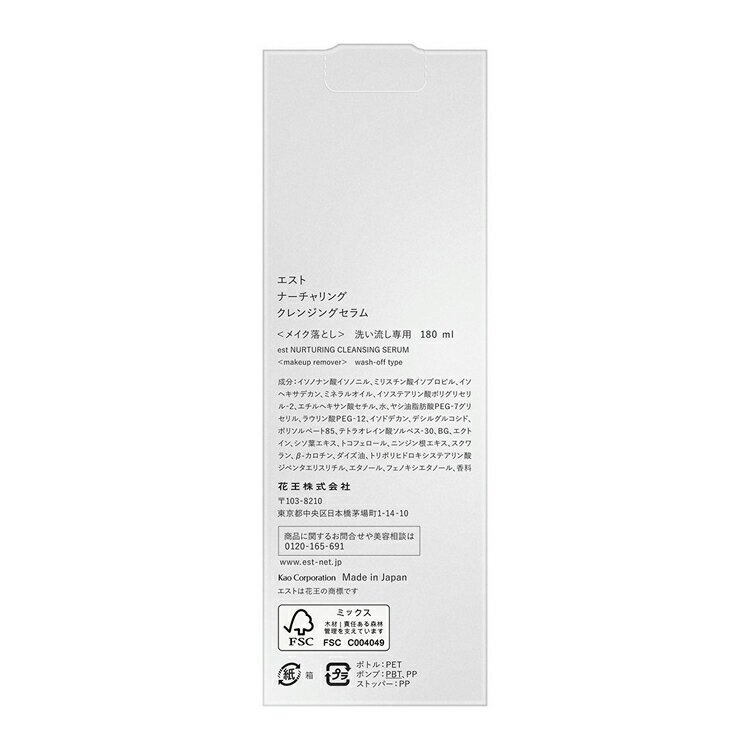 商品詳細 ハンドプレスで浮かして落とす、大人の素肌をいわたるハンドプレスクレンジング。毛穴に入り込んだメイク汚れや、すすぐだけでも発生する肌への摩擦。そんな事実に着目した、大人のためのクレンジング。摩擦レステクノロジーを採用し、やさしくハンドプレスするだけで、残留しがちなメイクや毛穴汚れまで浮かせて、素早くすすぎでオフ。なじませてからすすぎまでずっと、肌への摩擦を防ぎます。 使用方法 ・手や顔をぬらさずにお使いください。 ・適量(ポンプ3押し分)を手のひらに広げ、下のイラストにそって、顔全体にこすらずやさしく押さえるようにのせます。 ・落ちにくいメイクは1押し分を追加し、より丁寧になじませてください。 ・水またはぬるま湯で洗い流します。 ①鼻とほお内側、ほお外側、額、口周りの順にやさしく押さえるようになじませます。 ②薬指をアイラインに密着させるようにまぶた全体と眉を覆います。 ③マスカラは、まつ毛の根元から全体を上から押さえるように、薬指で5秒程度密着させます。その後、下からまつ毛を持ち上げるように5秒程度密着させます。 販売名 エスト ナーチャリング クレンジングセラム ブランド est(エスト) 商品区分 化粧品 内容量 180ml 商品サイズ 幅59mm×高さ171mm×奥行き43mm 原産国 日本 成分 全成分はこちら> 使用上の注意 ●傷、はれもの、湿疹等異常のあるところには使用しないでください。 ●肌に異常が生じていないかよく注意してご使用ください。肌に合わない時や、使用中、赤み、はれ、かゆみ、刺激、色抜け(白斑等)や黒ずみ等の異常が出た時、また日光があたって同じような異常が出た時は使用を中止し、皮フ科医へ相談してください。使い続けると症状が悪化することがあります。 ●目に入らないように注意し、入った時や異常(かすみ等)を感じた時は、こすらずすぐに充分洗い流してください。異常が残る場合は、眼科医にご相談ください。 ●コンタクトレンズをご使用の方は、レンズをはずしてからお使いください。 ●子供や認知症の方などの誤飲等を防ぐため、置き場所にご注意ください。 ●極端に温度の高い所や低い所、直射日光のあたる場所には置かないでください。 <火気にご注意ください> ●まつ毛エクステンション対応* *シアノアクリレート系のグルーを使用したまつ毛エクステンションにお使いいただけます。 ●アレルギーテスト済み ●肌が敏感な方*1の協力によるパッチテスト済み*2 *1 環境や体調などによって化粧品が一時的に合わなくなる方 *2 皮膚に対する刺激性を確認するテスト すべての方にアレルギーや皮膚刺激がおこらないというわけではありません。 メーカー・販売業者・広告文責 花王株式会社 03-3660-7111