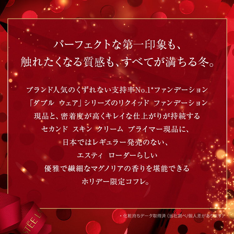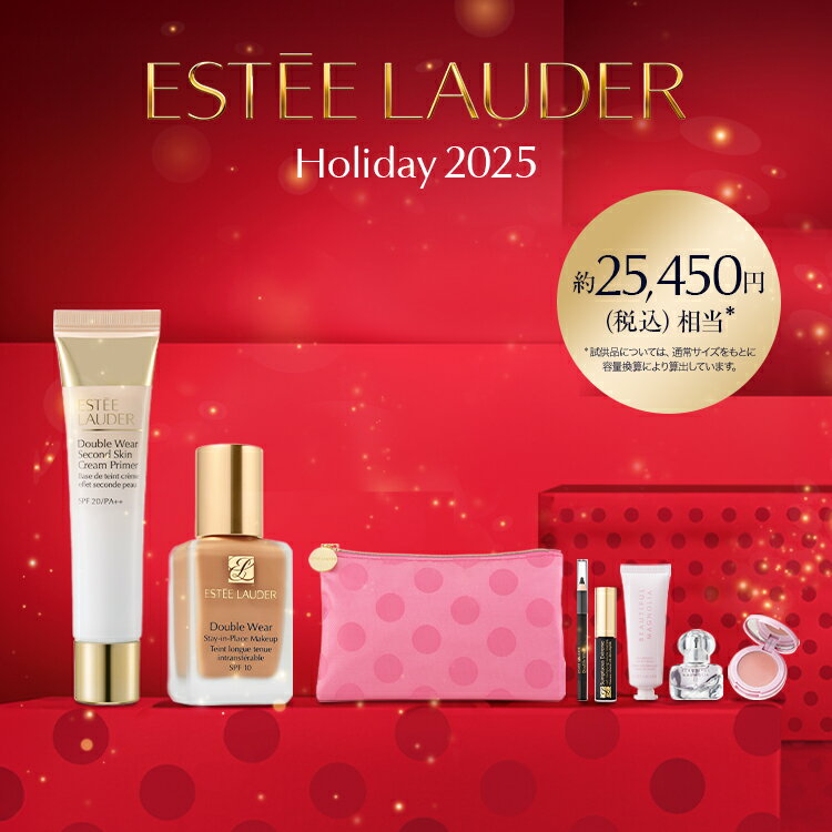 製品詳細 2025年11月20日(木) 公式オンライン ショップ限定発売 <約25,450円(税込)相当*1> パーフェクトな第一印象も、触れたくなる質感も、すべてが満ちる冬。 ブランド人気のくずれない支持率No.1*2ファンデーション「ダブル ウェア」シリーズのリクイッド ファンデーション現品と、密着度が高くキレイな仕上がりが持続するセカンド スキン クリーム プライマー現品に、日本ではレギュラー発売のない、エスティ ローダーらしい優雅で繊細なマグノリアの香りを堪能できるホリデー限定コフレ。 フラグランスのスペシャル サイズに加え、同じ香りの贅沢なハンドクリーム、さらに付属のオリジナル バッグにも収まるミニサイズのメークアイテムをセット。センスの光る贈り物としても最適で、特別なホリデーを香りから演出します。 ※数に限りがございますので、品切れの際はご了承ください。 *1 試供品の製品については、通常サイズをもとに容量換算により算出しています。 *2 化粧持ちデータ取得済(当社調べ/個人差があります) セット内容 ・ダブル ウェア ステイ イン プレイス メークアップ SPF10/PA++ (現品) ・ダブル ウェア セカンド スキン クリーム プライマー SPF20/PA++(現品) ・ビューティフル マグノリア オーデ パフューム スプレィ 4mL ・ビューティフル マグノリア ハンド クリーム 30mL ・サンプチュアス エクストリーム マスカラ 2.8mL ・ピュア カラー エンヴィ カラー リプレニッシュ リップ バーム 1.6g ・ダブル ウェア ウォータープルーフ ジェル アイ ペンシル 01 オニキス ・オリジナル バッグ(W200×D40×H120mm) 使用方法 ・ダブル ウェア ステイ イン プレイス メークアップ 美しく仕上げるポイントは「3S」。コツをつかめば、くずれにくく美しい仕上がりが簡単に。 「少量」 指の腹に少量を取り出します。顔半分には指の腹1/2の量、Tゾーンには指の腹1/4の量が目安です。 気になる部分がある場合は、薄く重ねづけをしてください。 「素早く」 片頬ずつ、指の腹を使って顔の中心から外側へ向けて、素早くのばします。その後、額→鼻すじ→鼻の下→あごの順番につけて、素早くのばします。 「スポンジ使い」 指の腹を使って7割程度のばした後に、スポンジを使って内側から外側へ向けて均一に、ポンポンと軽くたたくように、肌にぴったりとなじませます。 ・ダブル ウェア セカンド スキン クリーム プライマー ・指でプライマーをとり、5点おきします。 プライマーを中指にとり、ひたい、両ほほ、鼻、あごの5点にのせます。 ・指で顔全体の伸ばします。 両ほほの広い面から、指でプライマーを放射線状に伸ばします。 目まわりなど、ヨレの気になる部分には薄くのばします。 ・気になるところは重ね付け 毛穴が気になるところには毛穴に逆らうように下から上へと重ねます。 次に塗るファンデーションのための、最強のキャンバスのできあがりです。 また、アイシャドウベースとしても使用でき、さらに日中のベースメークのお化粧直しにも最適です。 ファンデーションのくずれに気になるところに、ファンデーションの上からそのままなじませます。 透明感と自然なつやが宿り、美しい仕上がりが長く保ちます。 販売履歴 2025/11/5まで ・ダブル ウェア ステイ イン プレイス メークアップ SPF10/PA++ (現品) ・ダブル ウェア セカンド スキン クリーム プライマー SPF20/PA++(現品) ・アドバンス ナイト クレンジング ジュレ 30mL ・アドバンス ナイト リペア SMR コンプレックス 7mL ・ダブル ウェア セカンド スキン クリーム プライマー SPF20/PA++ 15mL 2025/6/12まで ・ダブル ウェア ステイ イン プレイス メークアップ SPF10/PA++ (現品) ・ダブル ウェア セカンド スキン クリーム プライマー SPF20/PA++(現品) ・アドバンス ナイト クレンジング ジュレ 15mL ・アドバンス ナイト リペア SMR コンプレックス 7mL ・アドバンス ナイト リペア アイ ジェル SMR コンプレックス 5mL 2025/2/27まで ・ダブル ウェア ステイ イン プレイス メークアップ SPF10/PA++ (現品) ・ダブル ウェア セカンド スキン クリーム プライマー SPF20/PA++(現品) ・クリーン アクション フォーミング クレンザー 30mL ・マイクロ エッセンス ローション フレッシュ SF 30mL ・アドバンス ナイト リペア SMR コンプレックス 7mL ・アドバンス ナイト リペア アイ ジェル SMR コンプレックス 5mL ・シュープリーム プラス YP クリーム 15mL ・ダブル ウェア セカンド スキン クリーム プライマー 15mL ・ダブル ウェア ステイ イン プレイス メークアップ #サンド 7mL <アクセス集中時につきまして> アクセス・注文が殺到してしまった場合、システムの遅延や不具合が発生することがございます。 店舗からお送りするご注文確認メールをもちましてご注文確定となりますので、ご確認ください。 (楽天市場からの自動配信メールとは異なりますのでご注意ください) お客様には大変ご迷惑をおかけいたしますが、ご了承いただけますようお願い申し上げます。 メーカー名: ESTĒE LAUDER(エスティ ロ