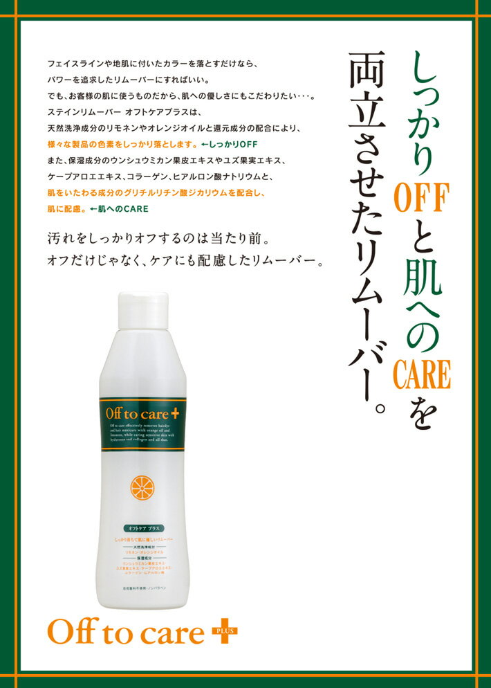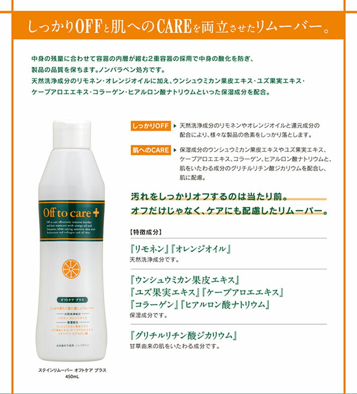 しっかりOFFと肌へのCAREを両立させたリムーバー フェイスラインや地肌に付いたカラーを落とすだけなら、 パワーを追求したリムーバーにすればいい。 でも、お客様の肌に使うものだから、肌への優しさにもこだわりたい…。 ステインリムーバーオフトケアプラスは、 天然洗浄成分のリモネンやオレンジオイルと還元成分の配合により、 様々な製品の色素をしっかり落とします。 また、保湿成分のウンシュウミカン果皮エキスやゆず果実エキス、 ケープアロエエキス、コラーゲン、ヒアルロン酸ナトリウムと、 肌をいたわる成分のグリチルリチン酸ジカリウムを配合し、肌に配慮。 【特徴成分】 「リモネン」「オレンジオイル」 天然洗浄成分です。 「ウンシュウミカン果皮エキス」 「ゆず果実エキス」「ケープアロエエキス」 「コラーゲン」「ヒアルロン酸ナトリウム」 保湿成分です。 「グリシルリチン酸ジカリウム」 甘草由来の肌をいたわる成分です。 内容量:450ml 広告文責: 株式会社デュオドリーム 03-5155-6507