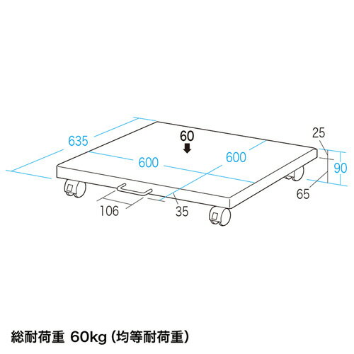 レーザープリンターをデスクの下などへ設置可能。スチール製プリンタースタンド。W600×D635×H90mm。LPS-T6060F サンワサプライ<特長>●大型レーザープリンターにも対応する、スチール製プリンター台です。●レーザープリンターなどの機器を机の下に収納できます。●ハンドル付きで前後の移動が行いやすくなっています。●各メーカー(brother CANON OKI RICOH EPSON Xroxなど)の売れ筋レーザープリンタに対応しています。※対応プリンターは、サンワサプライホームページをご参照ください。<仕様>■サイズ:W600×D635×H90mm (天板サイズ:W600×D600mm)■重量:4.9kg■梱包:1個口/660×629×61mm・6.0kg■出荷形態:ノックダウン組立式■材質:スチール(エポキシ紛体塗装)■耐荷重:60kg(均等耐荷重)<関連キーワード>4969887141120 LPS-T6060F,レーザー,プリンタスタンド,トロリー,ハンドル,キャスター付き,サンワサプライ,激安通販のイーサプライ デスク下収納 机下収納サイズ違い天板サイズ50×50cm天板サイズ60×60cm