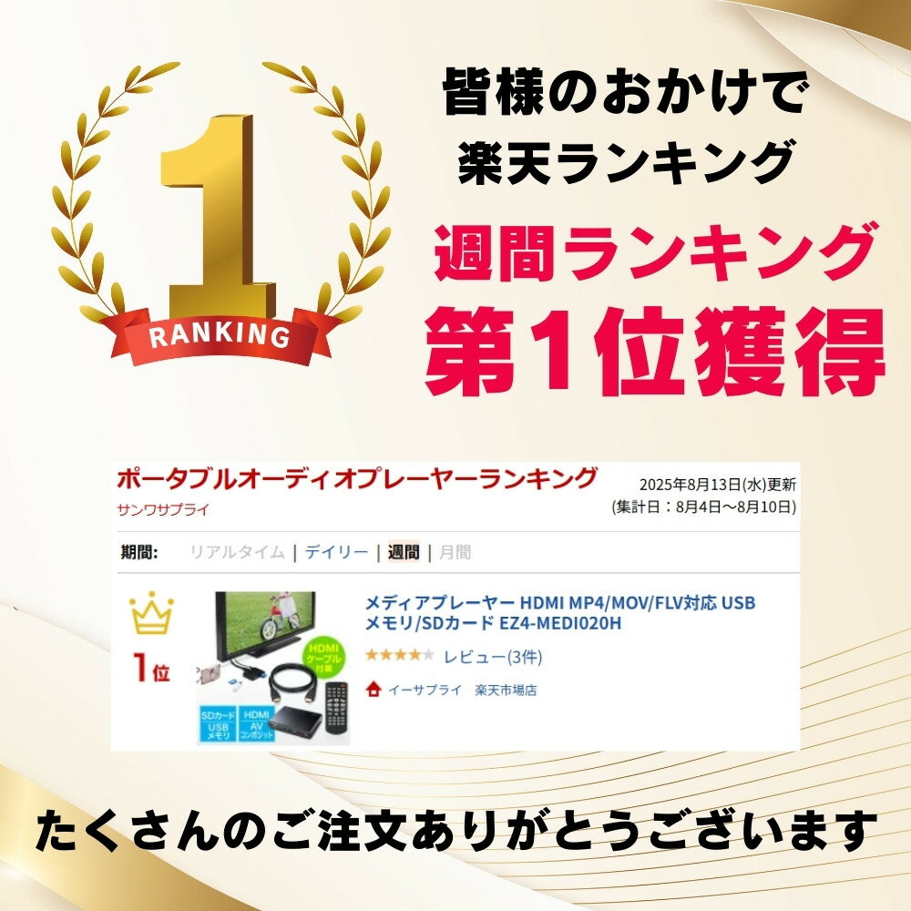 テレビとHDMIケーブルで接続して、パソコン不要でSDカードやUSBメモリのデータを再生できるメディアプレーヤー。オートプレイ機能、リピート再生機能付き。<特長>●デジカメで撮影した写真や映像、パソコンで作成した動画などを、テレビやプロジェクターで再生できるメディアプレーヤーです。●再生したいデータをUSBメモリ、またはSDカードに保存して本製品に接続すれば、パソコンを使うことなく再生できます。●動画・音楽ファイル再生時、リモコンのOSDボタンからリピート再生の設定が可能です。●画像ファイルのスライドショーができ、リモコンのOSDボタンからスライド効果や再生間隔の変更、BGMの設定が可能です。●付属のHDMIケーブルか別売りの専用AVケーブルで、テレビやプロジェクターに出力できます。【ご注意】※AVCHDフォーマットのMTSファイルは再生できません。MP4等へファイルを変換、また、ビットレート、フレームレートの変換をお試しください。※USB HDDでも再生できる場合がありますが、動作保証対象外になります。あらかじめご了承ください。※初回の起動時は、ACアダプタを接続すると自動で起動しますが、リモコンで電源をOFF後は必ずリモコンでの操作が必要になります。(オートプレイ時を除く)※動画再生の際、映像の乱れや音声が再生されないなどの症状が出た場合は、フリーソフトなどでコーデックやビットレート、フレームレートを 下げるなど、ファイルを変換してお試しください。高解像度の動画ファイルの場合、正常に再生されない場合があります。 また、デジタルサイネージ用ディスプレイや、50インチ以上の大画面テレビ、SHARP AQUOSでの再生の場合、映像のみが再生され音声が再生されないなど、 正常に再生できない可能性があります。その際も、一度コーデックやビットレート、フレームレートなどの変換をお試しください。 (例)動画フォーマット:MP4、コーデック/AVC H.264、ビットレート/10000Kbps以下、フレームレート/30fps以下※起動時に映像が乱れたり白黒で映ったりする場合は、映像入力がうまく伝送されていない可能性があります。 その場合は、リモコンの「AV」「HDMI」などを押して、出力の切り替えなおしをお試しください。※本製品の初期の出力設定は「HDMI」になっています。付属のケーブルを使用して出力する場合は、リモコンの「AV」ボタンを押して出力を切り替えて下さい。 また、ケーブルが正しく接続されているかのご確認をお願いします。※長時間再生した場合に、再生が停止したり、電源が落ちたりする場合があります。 長時間再生し本体に熱をもつ場合、保護回路機能が働いて電源が落ち、動作を停止する仕様となっております。 コーデックやビットレート、フレームレートの変換で改善する場合がありますので、一度お試しください。 なお、連続再生時間については使用環境や再生データにより異なるため、一概に定めておりません。※本製品は、Windows OSやMac OSでのFAT16・FAT32・NTFSでのフォーマットで利用できる製品になります。 家電製品などでフォーマットしたメモリでは動作保証対象外となりますので、Windows OSやMac OSでのフォーマットをお願いします。※下記のHDMIケーブルではご使用いただけません。 KM-HD20-A100L3/A150L3/A200L3/A300L3<仕様>■サイズ:W79.4×D58×H15.5■重量:約70g■スロット:USB A コネクタ(メス)×1SDメモリーカード対応スロット ×1■電源:ACアダプタ(DC5V/2A)■対応メモリフォーマット:FAT16、FAT32、NTFS■対応ビデオコーデック:MPEG1、MPEG2、MPEG4、SP、ASP、AVC(H.264)、XviD、DivX、WMV9(VC-1)、Real Video 8・9・10(最大720P)■対応ビデオフォーマット:AVI、MKV、TS、TP、M2TS、MPG、MP4、MOV、VOB、DAT、WMV、RM、RMVB、FLV■対応オーディオフォーマット:MP3、WMA、WAV、OGG、AAC、APE、FLAC、RA、AC3■対応画像フォーマット:JPG、BMP、PNG、GIF■対応字幕フォーマット:SRT、SMI、ASS、SSA、idx+sub、PGS■付属品:ACアダプタ(ケーブル長/約114cm)、専用HDMIケーブル(約90cm)、リモコン■生産国:中国■保証期間:ご購入日より6ヶ月■取扱説明書:あり<対応機種>■対応メディア:32GBまでのUSBメモリ、32GBまでのSDHCカード・SDカード※UHS-I/UHS-IIの高速転送には対応していません。※SDXCカードには対応していません。 <関連キーワード>400-MEDI020H サンワサプライ関連商品メディアプレイヤー専用リモコンラインナップ