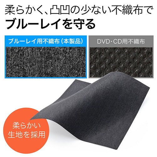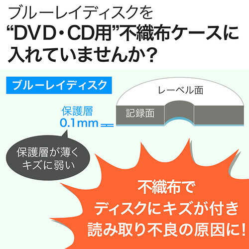 ブルーレイディスクの収納に対応した、不織布ケース。両面収納タイプで、1ケースにつき2枚収納可能。DVD・CDの収納も可能なブルーレイディスクケース。500枚入。ホワイト。<特長>●ブルーレイディスク収納対応の不織布ケースです。●ディスクを出し入れする際の摩擦によるキズを防止します。●ディスク接触面はレーベルインクが貼り付きにくいシボ加工を施しています。●ブルーレイディスクの記録面に跡を残しにくい、凸凹が少なく柔らかい不織布を使用しています。●不織布にはディスクを出し入れしやすい切れ込みと、飛び出しを防ぐサイドストッパーが付いています。●ブルーレイディスクの他、CDやDVDの収納にも最適です。●500枚入りで1枚のケースに2枚収納できる両面収納タイプです。●最大1000枚のブルーレイディスク、DVD、CDを収納できます。●ジャケットカードが収納可能で、表にメディア、裏にジャケットカードというような収納も行えます。●検索に便利なインデックスカード付きです。【ご注意】※保管時は必ず縦置きにしてディスク記録面に圧力がかからない状態で保管してください。※レーベル面を上にしてディスクを収納してください。※2枚以上のディスクを重ねて収納しないでください。※ディスク記録面が接する不織布表面部にゴミや汚れがないことをご確認ください。※12cmディスク専用です。その他のサイズのディスクは使用しないでください。※両面記録用ディスクは使用しないでください。データ面を破損することがあります。※ホコリの多いところ、高温・多湿の場所には保管しないでください。ケースやディスクが変形することがあります。※本製品を重ね置きしたり、重いものを乗せたりしないでください。※本製品はディスクに微小傷を一切つけずに収納・使用することを目的とした製品ではありません。<仕様>■カラー:ホワイト■サイズ:W132×D146×H0.5mm(ケース1枚あたり)■入数:500枚■収容量:ブルーレイディスク・DVD・CD2枚(ケース1枚あたり)■材質:PP■付属品:インデックスカード ×12シート(17面付・204枚分)×5セット■生産国:中国■保証期間:初期不良のみ■取扱説明書:なし<対応機種>■収納対応メディア:直径12cmのブルーレイディスク、DVD、CD<関連キーワード>200-FCD048W サンワサプライ ブルーレイディスク,不織布,ケース,500枚入,両面収納,ホワイト