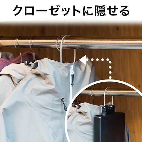 クローゼットのハンガーバーに吊るして隠せるセキュリティボックスです。キーレスのダイヤル式で印鑑・通帳・パスポート・CD・DVDなど保管できます。<特長>●ハンガーなどに吊るして、隠せる簡易セキュリティボックスです。●机周りの簡易セキュリティボックスとしても使えます。●4桁の暗証番号で、蓋部分をロックすることができます。●鍵は紛失の心配のないキーレスのダイヤル錠式で開錠番号を任意に設定できます。●通帳・パスポート・カード類や貴重品など大切なものも手軽に保管できます。●ABS樹脂で軽くて丈夫です。●内側に傷防止用スポンジが付いています。※本製品は雨のあたる屋外では使用しないでください。屋根のある場所でご使用ください。<仕様>■本体サイズ:W15.2×D4×H18.7cm(ケーブル含まず)■本体収納内寸:W14×D2.5×H14cm■ケーブル長:16.5cm■材質:ABS■重量:約250g■パッケージサイズ:W169×D42×H158mm■取扱説明書:あり(日本語)■生産国:中国<注意事項>・小口輸入品につき、運搬中に製品、箱などに汚れ、キズができる場合がございます。・防水ではありませんので直接雨など水滴がかかる場所には設置しないでください。<関連キーワード>セキュリティボックス ダイヤル式 金庫 隠し金庫 貴重品ボックス セーフティーボックス 貴重品収納 盗難防止 防犯グッズ へそくり 鍵収納 キーレス 暗証番号 吊り下げ ハンガー式 オフィス 店舗 ホテル 旅行 訪問介護 携帯金庫 持ち歩き金庫 現金 家庭用 軽量 簡易金庫 ミニ金庫 防犯対策 鍵保管 シークレットボックス