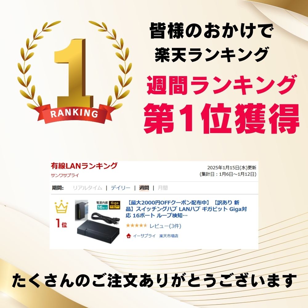 電源を内蔵しマグネット付きでスチールデスク等に固定できる1000BASE-T対応のスイッチングハブ。※箱にキズ、汚れがありますが商品は新品です。<特長>●1000BASE-Tに対応した、16ポートスイッチングハブです。●強力マグネットを搭載しスチール製デスクやキャビネットなどにしっかり固定できます。●別売りのデスククランプ(TAP-F37CLAMP/サンワサプライ製)取り付に対応し、木製デスクなどにもしっかり固定することができます。●電源内蔵なのでコンセント周りをすっきりと配線できます。●ループ検知機能を搭載しており、ループ障害を音とLEDで知らせます。※同機能を持つ他社製品との混在環境では、動作が不安定になる恐れがあります。●ファンレス仕様なので、動作音が静かです。●ストレートケーブル、クロスケーブルを気にせず使える、AUTO-MDIX機能を搭載しています。●接続する機器に合わせて10/100/1000Mbps自動切り替えが可能な、AUTO-Negotiation機能を搭載しています。●リンクしていないポートを自動判別し電力供給を抑える省電力機能を搭載しています。全ポートのパソコンをシャットダウンした場合は最大57%の省電力が可能です。●プラスチックケース採用のコンパクトデザインなので、設置場所を選びません。<仕様>■ポート数:16ポート■規格:IEEE802.3(10BASE-T Ethernet)IEEE802.3u(100BASE-TX Fast Ethernet)IEEE802.3ab(1000BASE-T)IEEE802.3x(Flow control for Full-Duplex)■アクセス方式:CSMA/CD■スイッチング方式:Store&Forward■伝送方式:100Mbps/10Mbps(全二重、半二重)、1000Mbps(全二重)■ポート構成:1000BASE-T/100BASE-TX/10BASE-T(RJ-45) AUTO-MDIX×16ポート■バッファメモリ:512Kbytes(各ポートに動的割当て)■フローコントロール制御:有り■スイッチファブリック:32Gbps■最大パケット転送能力:23.8Mpps■フィルタリング速度:1488000パケット/秒(1000Mbps)、148800パケット/秒(100Mbps)、14880パケット/秒(10Mbps)■MACアドレステーブル:8K■AUTO MDIX:あり■オートネゴシエーション:対応(1000/100/10Mbps)■VCCI規格:CLASS B認証取得■サイズ:本体/W216×D118×H42mm壁掛け用ホール/約W18×D8×H2.4mm■重量:約514g(本体のみ)■ケーブル長:1.5m■消費電力(MAX):9.23W■動作時環境:使用時温度/0〜40℃、使用時湿度/10〜90%(結露なきこと)保管時温度/-20〜70℃、保管時湿度/5〜90%(結露なきこと)■付属品:電源ケーブル×1、壁掛けセット×1、取扱説明書■メーカー保証期間:1年※本製品は通電のみの場合と通信を行っている場合とでは発熱量が異なります。※特に通信を大量に継続して行うと、本体は過熱状態になる場合があります。※風通りの少ない放熱の悪い環境での連続使用は、内部部品の劣化を招き、製品寿命を低下させる恐れがあります。※ご使用になる場合には本体上部に何も乗せず、通風口は10cm以上空間をあけて設置してください。<関連キーワード>4969887755037 LAN-GIGAP1602BK サンワサプライ スイッチングハブ LANハブ ギガビット Giga対応 16ポート マグネット付き 電源内蔵 クランプ取付 壁掛け対応 静音 軽量 ブラック デスク取付 ラック取り付け プラスチック筐体 小型 省電力 クランプ固定 ループ検知機能 スイッチングHUB LANHUB オフィスネットワーク仕様違い5ポート8ポート16ポート24ポート