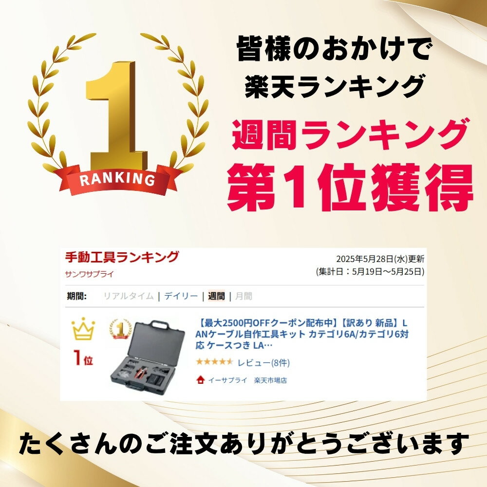 CAT6A LANケーブル自作の必需品、工具、コネクタ、テスターをコンパクトにまとめたセット。※箱にキズ、汚れがありますが商品は新品です。<特長>●カテゴリ6A LANケーブル、カテゴリ6LANケーブルを自作するためのパーツと工具のセットです。●この工具キット一つで、どこでもLANケーブルを自作加工することができます。※ケーブルは付属していません。●持ち運びに便利な収納ケース付きです。<仕様>■セット内容(型番):LANケーブルテスター×1(LAN-TST6)かしめ工具×1外皮むき工具(スパイキ機能付き)×1(LAN-TL11)カテゴリ6A RJ-45コネクタ(単線用)×10(ADT-6ARJ-10)カテゴリ6 RJ-45コネクタ(単線用)×10(ADT-6RJ-10N)モジュラーカバー(ケーブル径5.5〜7.0mm対応)×20(ADT-MC9)収納ケース×1/W380×D300×H63mm■メーカー保証期間:なし<関連キーワード>4969887755280 LAN-TLKIT3,LANケーブル,自作,工具,仕様ちがいカテゴリ6/5e対応カテゴリ6A/6対応