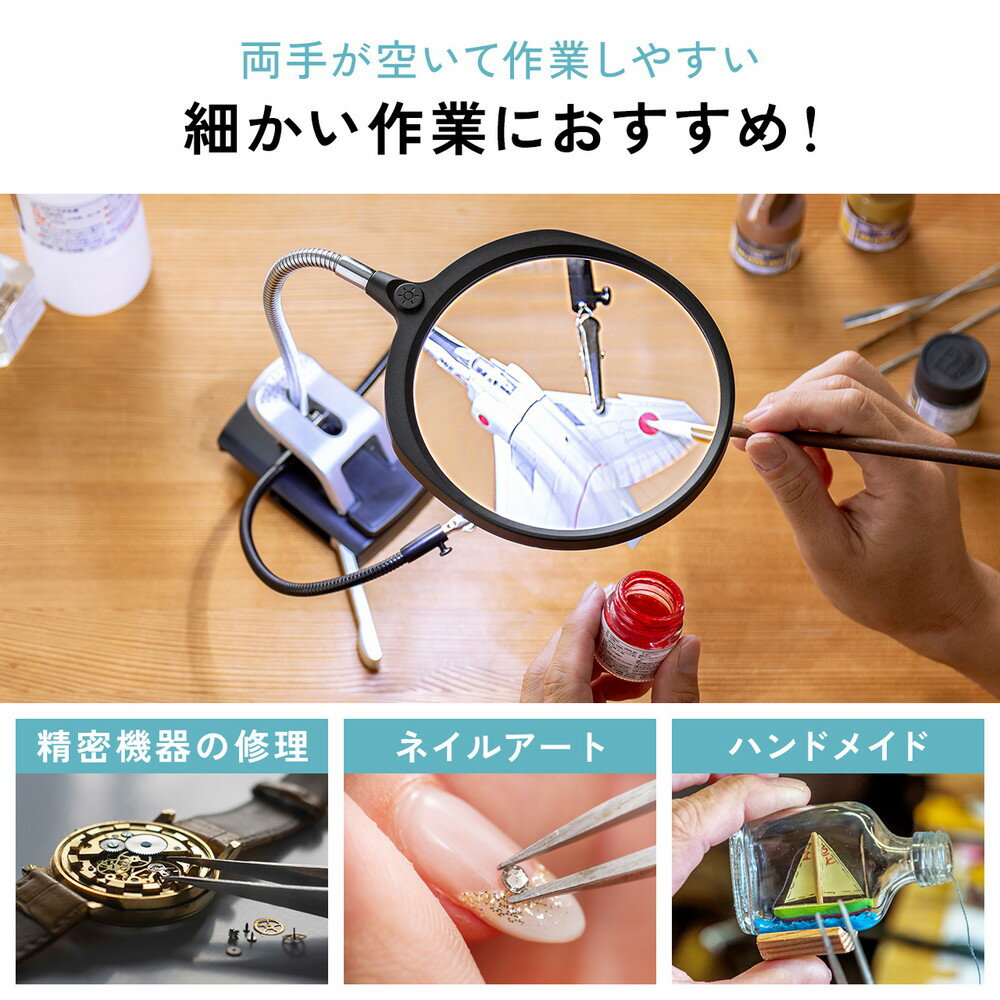 2本のアーム付きで、物をしっかりホールド可能。クリップで挟んで取り付け、スタンドで設置もできるスタンドルーペ。レンズの大きさ13cm。LEDライトも8灯で明るく照らすことができる付拡大鏡。クリップスタンド型。充電式で繰り返し使える、レンズカバー付きのルーペ。<特長>●直径13cmで2倍率の大型レンズを採用し、手元がより見えやすくなるスタンド拡大鏡です。●自立できるスタンドタイプで、両手が空くので作業しやすく細かい作業におすすめです。●LEDは8灯搭載し、広範囲を照らすことができます。●設置方法は、手軽に設置、安定感のあるスタンド、挟み込むだけで取り付けできるクリップ式の2通りに対応しています。●好きな場所で使用でき、場所を選ばない充電電池を内蔵。一度の充電で最大6時間連続使用が可能です。●割れにくく扱いやすいアクリル製レンズを採用しています。●高さや角度等はフレキシブルアームを採用しています。●クリップアームを搭載し手芸やプラモデルのパーツを挟んで固定することができます。<仕様>■商品サイズ:約W135×D140×アーム長400mm(スタンドを広げた場合・アームを除く)■商品重量:約530g■電池動作時間;最大輝度2時間、中輝度4時間、低輝度6時間■充電時間:約1時間■レンズサイズ:直径130mm(可視部分125mm)■バッテリー残量:500mAh■LED数:8灯■倍率:2倍■レンズ材質:アクリル■付属品:レンズカバー、充電ケーブル(Type-C/USB A 約95cm)■生産地:中国■保証期間:ご購入日より6ヶ月■取扱説明書:日本語取扱説明書あり<関連キーワード>スタンドルーペ 拡大鏡 クリップ付きアーム LEDライト 13cmレンズ フレキシブルアーム 天板固定用クリップ クランプ固定 改良版 400-LPE021 サンワサプライ仕様ちがいアームなしアーム付き
