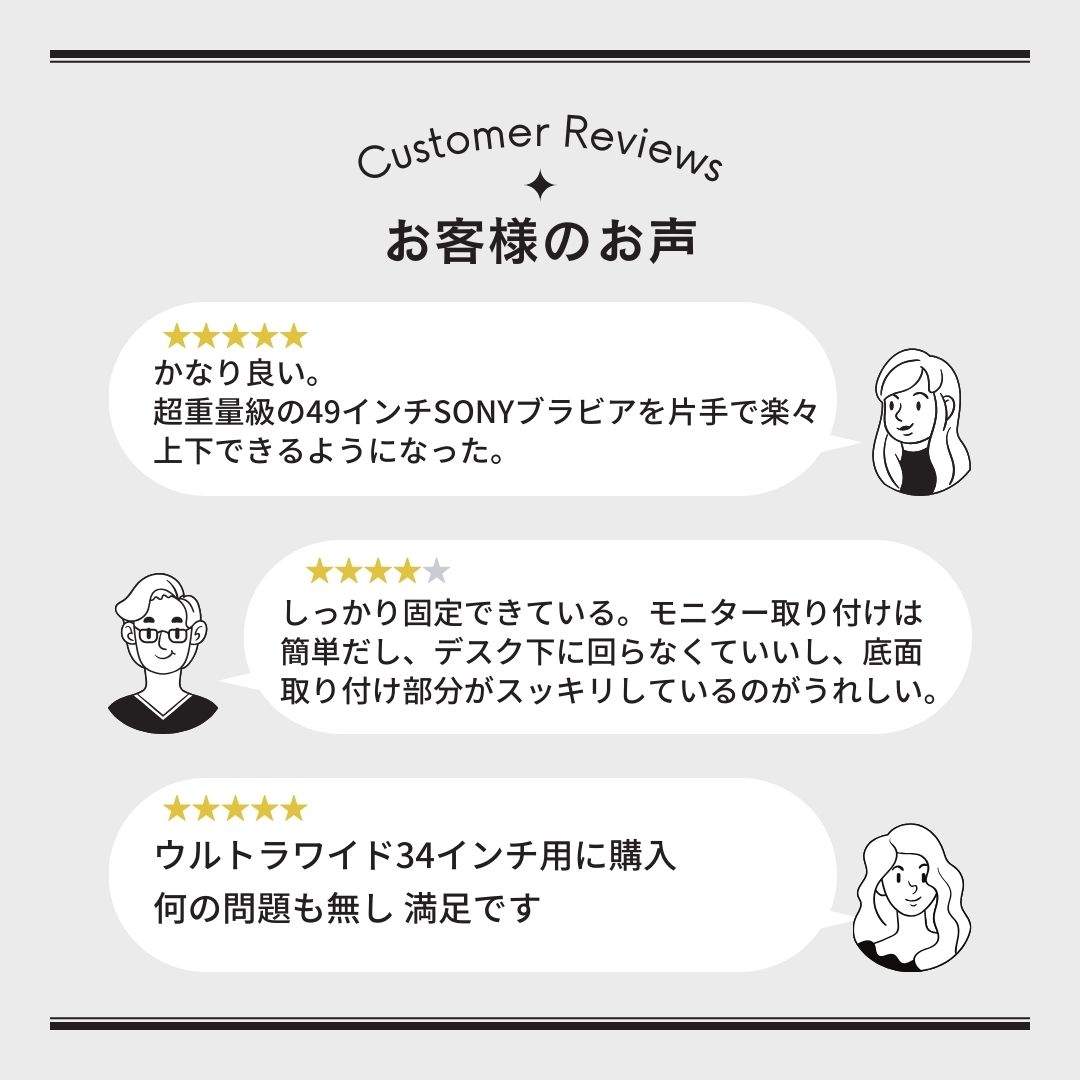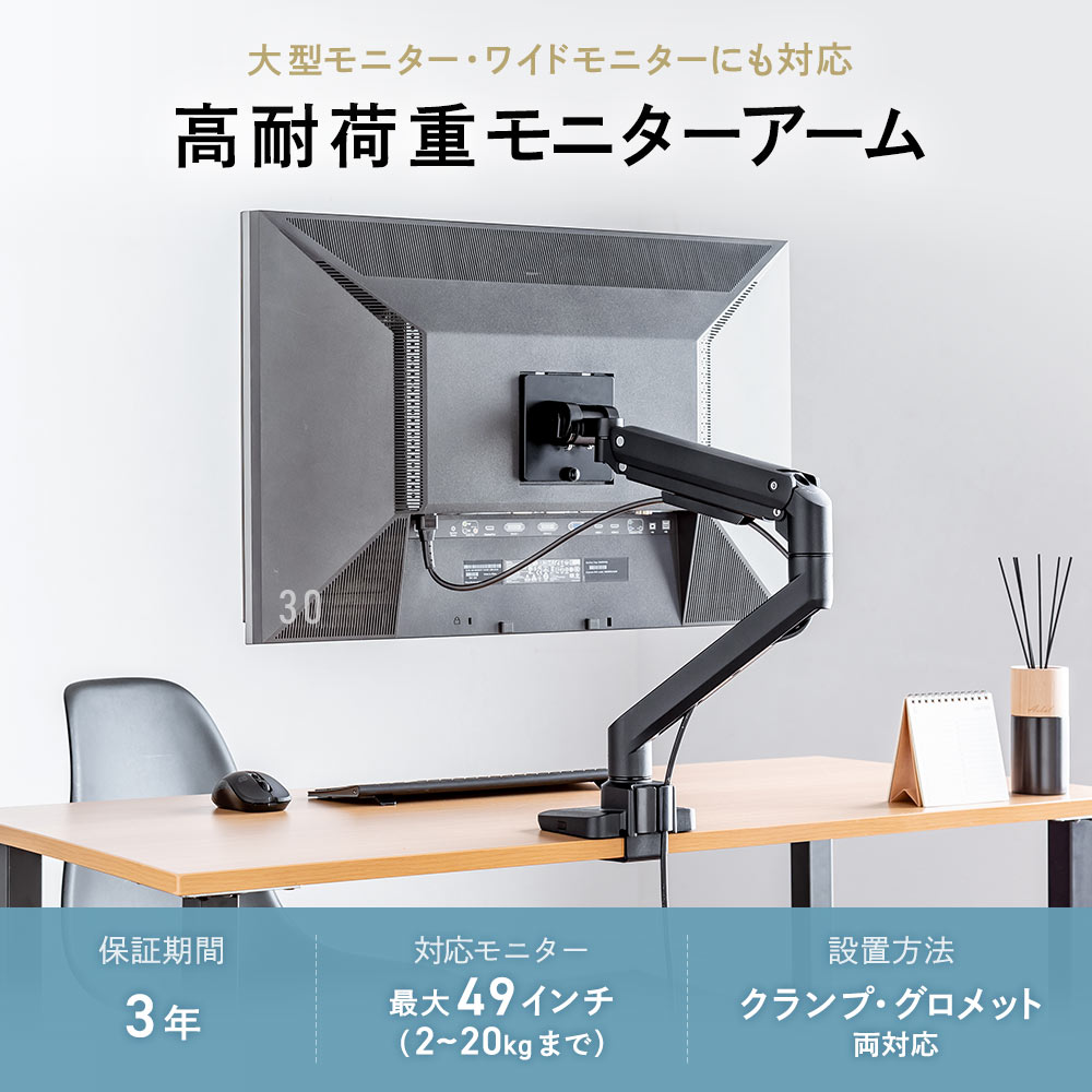 2〜20kgのモニター対応の高耐荷重のモニターアーム。大型モニターやウルトラワイドモニターにも。<特長>●重さ2〜20kgのモニターに対応した高耐荷重のモニターアームです。●取り付け方法はクランプ式・グロメット式、両対応です。●ご購入日より3年間の製品保証付きです。期間内に発生した製品不具合に関して、無償交換または修理・返品を承ります。●大型モニターや、ウルトラワイドモニターなどの設置にもおすすめです。●各関節で角度調整が可能なので、見たい位置・角度にモニターを動かせます。●ガススプリング式で、上下の位置調整も可能です。<仕様>■サイズ:寸法図参照■重量:3.5kg■製品パッケージサイズ:W405×D196×H116mm■製品パッケージ重量:4.0kg■材質:スチール/アルミ/プラスチック■可動範囲:画面上下(チルト)/上下70°、画面左右(パン)/180°、画面回転(ローテーション)/360°■総耐荷重:2〜20kg■付属品:モニター取付け用ボルト、ボルト(グロメット式固定用)■保証期間:3年■原産国:中国 ■取扱説明書:あり(日本語)■対応モニターサイズ:15・15.6・16・17・18.5・19・19.5・20・20.7・21・21.5・22・23・23.8・24・26・27・31.5・32・34・37・39・40・42・43・46・48・49インチなど※モニターの耐荷重 2〜20kg※湾曲モニターはその構造上、平面モニターに比べモニターアームに負荷がかかりやすいため、 耐荷重に余裕のあるモニターアームをお選びください。■対応モニター参考メーカーIO DATA(IOデータ)・アトランティス(ATLANTIS)・iiyama(イイヤマ)・AOC・Acer(エイサー)・ASUS(エイスース・アスース)・EIZO(ナナオ)・MSI(エムエスアイ)・HP(ヒューレッド・パッカード)・LGエレクトロニクス(LG Electronics)・シャープ(SHARP)・DELL(デル)・フィリップス(PHILIPS)・ドウシシャ(DOSHISHA)・ViewSonic(ビューテック)・BenQ(ベンキュー)など■VESA:75×75、100×100(mm)・小口輸入品につき、運搬の際製品、箱などに汚れ、キズができる場合がございます。<関連キーワード>モニターアーム 最大49インチ 大型 アーム式 ガススプリング グロメット 高さ 角度 上下 左右 VESA おすすめ ディスプレイアーム 液晶モニター 大型モニター PCモニターアーム ガス式 シングルアーム ブラック 液晶ディスプレイ テレワーク 角度調節 ガス圧 フライトシミュレーター CAD 湾曲モニター ゲーミングモニター 重いモニター 大型ディスプレイ 50インチ