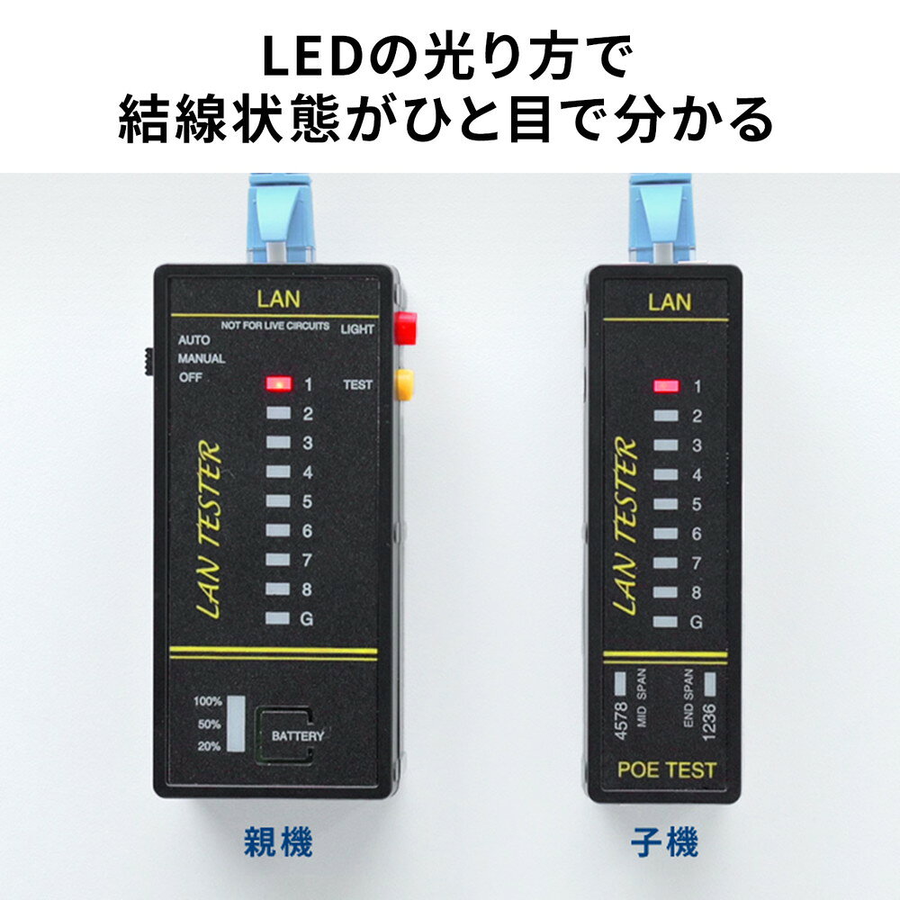 LANテスター PoEチェッカー機能 RJ-45 RJ-11 親機/子機脱着可 マグネット取付け LED表示 LEDライト内蔵 9V乾電池 電池残量LED EZ5-LANTST5