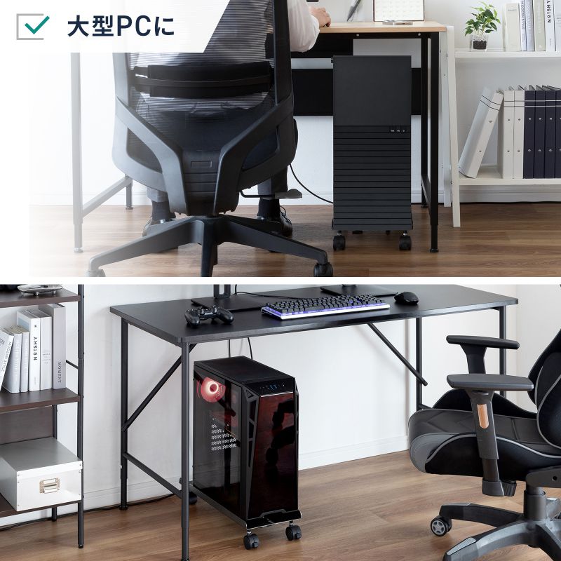 幅を自由に調整できるキャスター付きスチール製CPUスタンド。移動もスムーズで、大型PCにも対応。ブラック。<特長>●幅は200〜260mmまで調整可能で、さまざまなサイズのPCに対応できます。●スチール製の頑丈な構造で、最大50kgまでの重量に耐えられます。●キャスター付きで移動がスムーズです。清掃やレイアウト変更時にも便利です。●大型のゲーミングPCにも対応し、高性能なマシンもしっかり支えます。●安定感のある設計で、デスク下やオフィス環境でも安心して使用できます。<仕様>■出荷形態:ノックダウン組立式(お客様組み立て)■梱包:1個口/W550×D120×H80mm・1.95kg■材質:スチール(エポキシ樹脂粉体塗装)■カラー:ブラック■総耐荷重:50kg■キャスターの有無:あり■キャスター径:40mm■サイズ:W200〜260×D500×H92mm■重量:1.6kg■有効内寸:幅/198〜258mm奥行/500+100mm程度■保証期間:初期不良のみ≪ご注意≫※キャスターは長距離の移動を想定したものではありません。<関連キーワード>CPUスタンド CPU台 ゲーミング用 デスクトップ用 キャスター付き 耐荷重50kg スチール製 ほこり対策 無段階調節 CP-053 4969887146842
