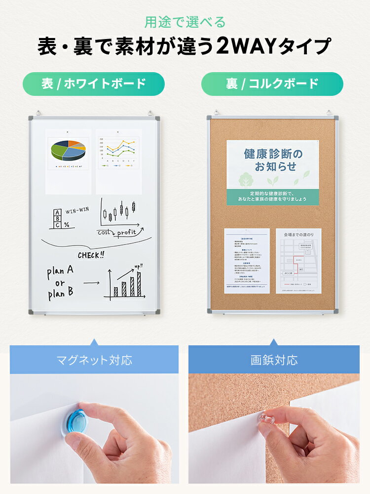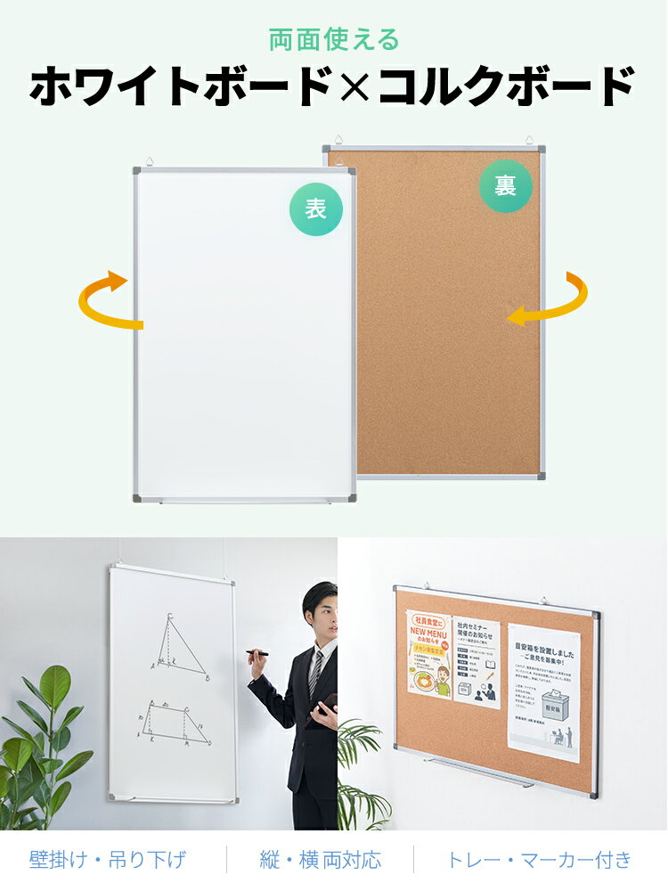 ホワイトボード コルクボード 両面ボード 吊り下げと壁掛けOK 縦横対応 トレーとペン付で即使用可 EEX-WD05