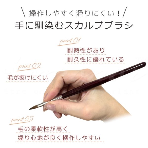 商品名 ジェルネイル 高品質 スカルプブラシ4種 4号、6号、8号、12号 【仕様説明】 操作しやすく滑りにくい!手に馴染むスカルプブラシです。 耐熱性、耐久性に優れた毛質。 毛の柔軟性が高く、握り心地が良く操作しやすいのが特徴です。 【商品特徴】 ・操作しやすく滑りにくい!手に馴染むスカルプブラシ ・耐熱性があり耐久性に優れている ・毛が抜けにくい ・毛の柔軟性が高く握り心地が良く操作しやすい ・柄に番号があり分かりやすい! サイズ・容量 4号:全長:16.7cm 筆長:1.3cm 筆幅:0.3cm 6号:全長:16.7cm 筆長:1.5cm 筆幅:0.4cm 8号:全長:17.5cm 筆長:1.7cm 筆幅:0.5cm 12号:全長:17.5cm 筆長:2.1cm 筆幅:0.6cm ※ロットによりサイズに多少のずれが生じる場合がございます。 注意事項 ●サイズの表記は目安でございます。ロット、個体により差がございます。ご了承お願いします。 ●入荷ロットやお持ちの端末によって色味が変わる場合がございます。 ●輸送時にケースに細かい傷や小さいヒビが入っていることがございます。 ●海外製品のため小さな傷や製造にムラがある場合がございます。あらかじめご了承の上ご注文ください。 検索 ネイル ジェルネイル ネイル用品 手作り ハンドメイド 耐熱 耐久 筆 ブラシ 高品質 長さだし セルフネイル ネイルブラシ スカルプチュア