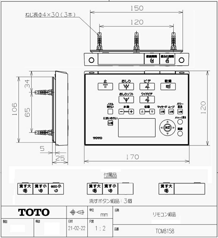 こちらは後払い決済不可商品でございます。「銀行振込」「クレジットカード決済」「コンビニ決済」にてお申し付けください。 【商品概要】 品番:TCM8158 流すボタン:あり 付属品:ハンガ組品(TCM1848)、流すボタン組品3個 (説明書に従い、適した流すボタンを取り付けてください) 代表適合品番: TCF4733、TCF4733AF、TCF4733AFS、 TCF4733AK、TCF4733AKS、TCF4733AM、 TCF4733AMS、TCF4733S 【注意】 ・リモコンは外観が同じものが多くあります。リモコンをお求めの際は、必ずご使用の便器機能部の品番をご確認のうえ、お買い求めください。 ご購入後の返品、交換はいたしかねます。 【商品に関するお問い合わせ先について】 TOTO商品についてご不明な点がございましたら、下記までお問合せください。 TOTOカスタマーサービス TEL:0120-03-1010 長期間(10年以上)お使いの製品の場合はお取替えもご検討ください