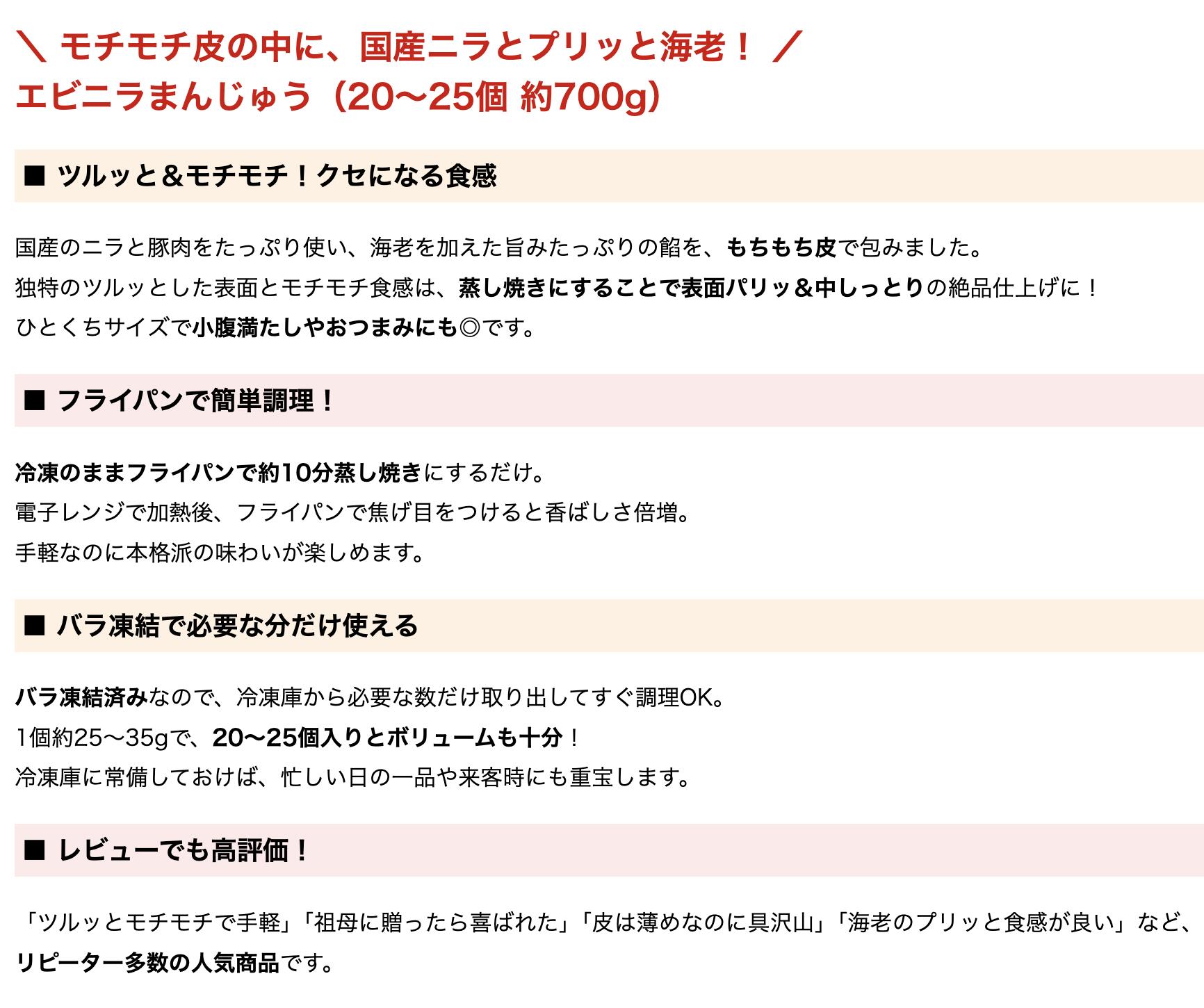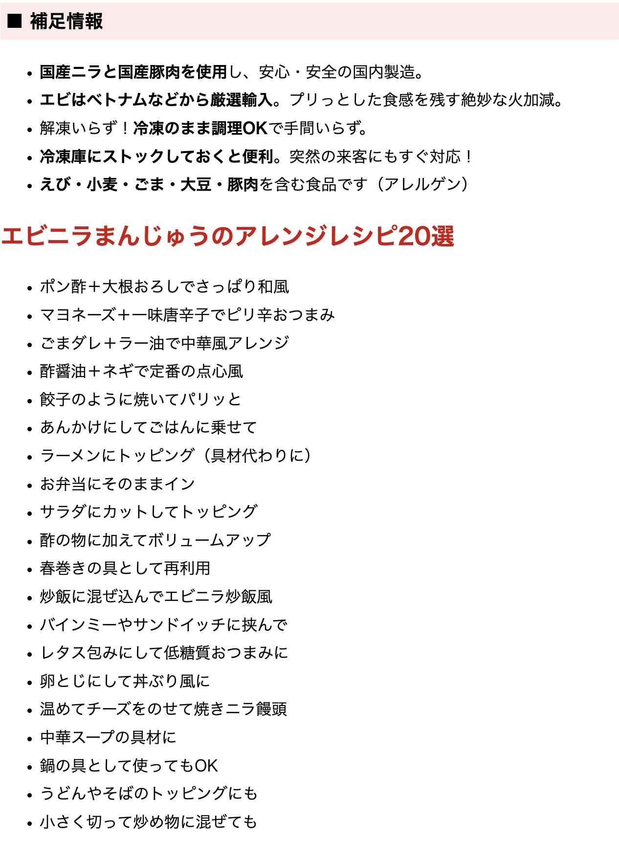 名称(内容量) エビニラまんじゅう 20-25個(1個約25-35g) 賞味期限 商品に記載 製造日より6カ月 保存方法 冷凍保存してください 原材料 皮(小麦粉、もち粉、還元水飴、粉末油脂)、ニラ(国産)、豚肉(国産)、えび(ベトナム他)、豚脂、砂糖、しょうゆ、紹興酒、植物油、ごま油、食塩、干し椎茸、エビエキス、香辛料/加工でんぷん、調味料(アミノ酸)、ソルビトール、(一部にえび・小麦・ごま・大豆・豚肉を含む) 最終加工地 国内 販売者 株式会社えつすい 福井県敦賀市砂流43-6-3(配送センター) <当店の売れ筋商品ラインナップ>気になるものがあれば、検索窓に入れてみてください!同梱大歓迎!1,000を超える商品のどの組み合わせでも5商品以上購入で送料無料(一部地域は千円引)※ただし、1円商品と馬刺しのタレは1商品カウントされません☆ 馬刺し各種部位も多数有り☆ 伊勢海老オマール・赤海老なども有り☆ 国産うなぎ一色うなぎ・薩摩うなぎなども有り☆ ローストビーフポーク・チキン・ターキーも有り☆ 揚げ物エビフライ・カキフライ・コロッケ・各種串カツなども有り☆ カット野菜国産ゴーヤ・モロヘイヤ・アボカドダイスが人気!☆ 手羽先餃子☆ 牛タンタン先・スライス・仔牛のタンも有り☆ お肉やステーキ格安の牛バラ・豚バラから松阪牛・飛騨牛のA4・A5ランクまで有り牛肉・豚肉・鶏肉・ミックスホルモン各種も有り☆ あん肝(あんこうの肝)☆ 魚介ホタテ・サザエ・甘海老・北海道産いくら・あわびなど有りホッキ貝・つぶ貝・赤貝も売れ筋!☆ おかず系ロールキャベツ・ハンバーグ・オニオンリングなども有り☆ 干物ハタハタ・コマイが人気!☆ 乾物乾燥わかめ・海苔・昆布が有り☆ 買い回りに便利なメール便商品メンマ・ザーサイ・甘納豆・ミックスナッツ・山菜ミックス、1000円ポッキリ商品なども有り☆ お肉ベーコン・Tボーン・牛バラ・リブロース・ウインナー・ハムなども有り☆ お魚鯖・スモークサーモン・のどぐろ・ししゃもなども有り☆ パーティー系ピザ・チーズ・生ハム・ワニ肉・丸鶏チキンなども有り角煮・チャーシュー・鶏のたたきが売れ筋!☆ ご当地グルメ焼き鯖寿司・なまこ酢・らふてぇ・ほうば味噌・朴葉・海ぶどうなどが人気!その他にも多数取り扱いがありますので、是非ともお買い回りください。メルマガにご登録されますと、割引情報やクーポン発行、プレゼント商品などのお得な情報を不定期的に配信しております。ぜひともご利用ください! メルマガ登録はこちら\ モチモチ皮の中に、国産ニラとプリッと海老! /エビニラまんじゅう(20〜25個 約700g) ■ ツルッと&モチモチ!クセになる食感 国産のニラと豚肉をたっぷり使い、海老を加えた旨みたっぷりの餡を、もちもち皮で包みました。 独特のツルッとした表面とモチモチ食感は、蒸し焼きにすることで表面パリッ&中しっとりの絶品仕上げに! ひとくちサイズで小腹満たしやおつまみにも◎です。 ■ フライパンで簡単調理! 冷凍のままフライパンで約10分蒸し焼きにするだけ。 電子レンジで加熱後、フライパンで焦げ目をつけると香ばしさ倍増。 手軽なのに本格派の味わいが楽しめます。 ■ バラ凍結で必要な分だけ使える バラ凍結済みなので、冷凍庫から必要な数だけ取り出してすぐ調理OK。 1個約25〜35gで、20〜25個入りとボリュームも十分! 冷凍庫に常備しておけば、忙しい日の一品や来客時にも重宝します。 ■ レビューでも高評価! 「ツルッとモチモチで手軽」「祖母に贈ったら喜ばれた」「皮は薄めなのに具沢山」「海老のプリッと食感が良い」など、 リピーター多数の人気商品です。 ■ 商品詳細 商品名エビニラまんじゅう(にら饅頭) 内容量約700g(20〜25個) 賞味期限製造日より冷凍保存で6ヶ月 保存方法冷凍保存(-18℃以下) 調理方法凍ったままフライパンで約10分蒸し焼き 原材料皮(小麦粉、もち粉、還元水飴、粉末油脂)、ニラ(国産)、豚肉(国産)、えび(ベトナム他)、豚脂、砂糖、しょうゆ、紹興酒、植物油、ごま油、食塩、干し椎茸、エビエキス、香辛料/加工でんぷん、調味料(アミノ酸)、ソルビトール、(一部にえび・小麦・ごま・大豆・豚肉を含む) 最終加工地国内 販売者株式会社えつすい(福井県敦賀市砂流43-6-3) ■ 補足情報 国産ニラと国産豚肉を使用し、安心・安全の国内製造。 エビはベトナムなどから厳選輸入。プリっとした食感を残す絶妙な火加減。 解凍いらず!冷凍のまま調理OKで手間いらず。 冷凍庫にストックしておくと便利。突然の来客にもすぐ対応! えび・小麦・ごま・大豆・豚肉を含む食品です(アレルゲン) エビニラまんじゅうのアレンジレシピ20選 ポン酢+大根おろしでさっぱり和風 マヨネーズ+一味唐辛子でピリ辛おつまみ ごまダレ+ラー油で中華風アレンジ 酢醤油+ネギで定番の点心風 餃子のように焼いてパリッと あんかけにしてごはんに乗せて ラーメンにトッピング(具材代わりに) お弁当にそのままイン サラダにカットしてトッピング 酢の物に加えてボリュームアップ 春巻きの具として再利用 炒飯に