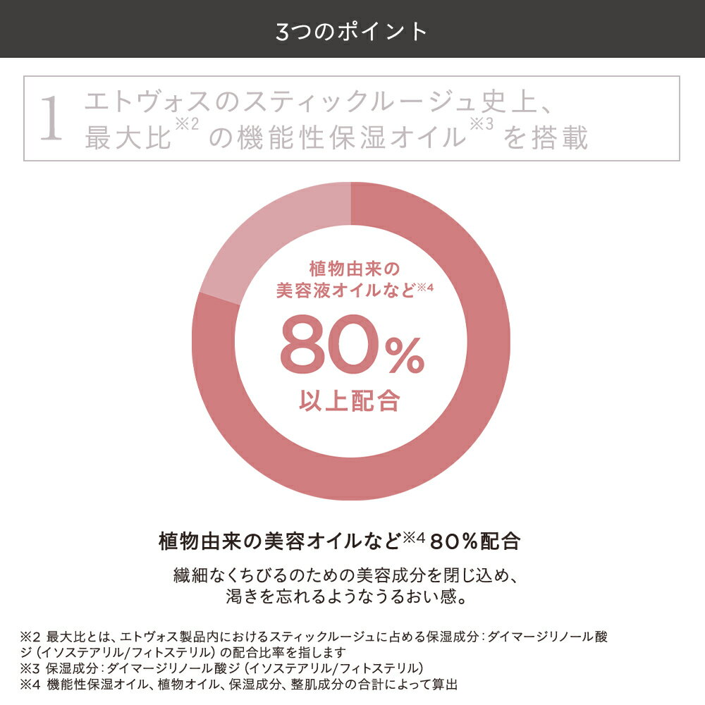 溢れ出すような美容成分を閉じ込めたしなやかな極薄ベールが、繊細なくちびるを瞬時にラミネート※。 みずみずしさと美しいツヤ、シアーな発色が表情に溶け込み、いきいきとした血色感を与えて、あなたらしさを描き出します。 繊細なくちびるに、ルージュをまとう喜びを。 すべてのくちびるに、うるおいで満たされる心地よさを。 ※メイクアップ効果による Point1 繊細なくちびるが求める上質なうるおいを追求した美容液ルージュ。 繊細なくちびるのための、特別な美容液ルージュをつくりたい。 美しい発色をもたらすルージュとしてのメイクアップ効果に、保湿力を持たせる挑戦は、10年前からはじまりました。 乾燥によるくすみを一瞬で忘れるような発色とツヤをもたらすメイクアップ効果も一切、妥協はしない。 「保湿ファースト」の製品開発のポリシーを守りながら、さらに保湿成分を注ぎ込み、徹底的にくちびるのケア効果を追求。 気休めではない保湿力が、まとうたびにくちびるを心地よくうるおし、悩みを忘れる美しいフォルムを演出します。 Point2 天然着色料で叶えた、表情に溶け込むシアー発色。 繊細なくちびるを悩ませる「くすみ」を徹底研究。 どの色を選んでも顔色になじみやすいように計算された、絶妙なシアー発色が、 血色感になりすますように、自然に表情に溶け込みます。 Point3 クレンジング要らず。石けんで簡単にメイクオフ。 植物由来のオイル・ワックス・美容成分と、天然のミネラルと色素だけでつくられています。 シリコン・鉱物油・界面活性剤・合成香料・防腐剤は不使用で、クレンジング剤は不要。 石けんで落とすことができるので皮膚が敏感な方にもおすすめです。 全成分 フローズンピンク:ダイマージリノール酸ジ(イソステアリル/フィトステリル)、キャンデリラロウ、トリベヘニン、(ラズベリー種子油/コハク酸トコフェロール)アミノプロパンジオールエステルズ、アルガニアスピノサ核油、メドウフォーム種子油、ヒマワリ種子油、ヤシ油、ホホバエステル、アロエベラ葉エキス、シロバナルーピン種子エキス、アフリカマンゴノキ核脂、シロキクラゲ多糖体、グリチルレチン酸ステアリル、オクチルドデカノール、コハク酸ジヘプチル、水添ココグリセリル、トコフェロール、(カプリロイルグリセリン/セバシン酸)コポリマー、ジイソステアリン酸ポリグリセリル-3、グンジョウ、酸化チタン、酸化鉄、ジイソステアリン酸ダイマージリノレイル、水酸化Al、ホウケイ酸(Ca/Al)、マイカ、マルトデキストリン、カルミン フロッキーコーラル:ダイマージリノール酸ジ(イソステアリル/フィトステリル)、キャンデリラロウ、トリベヘニン、(ラズベリー種子油/コハク酸トコフェロール)アミノプロパンジオールエステルズ、アルガニアスピノサ核油、メドウフォーム種子油、ヒマワリ種子油、ヤシ油、ホホバエステル、アロエベラ葉エキス、シロバナルーピン種子エキス、アフリカマンゴノキ核脂、シロキクラゲ多糖体、グリチルレチン酸ステアリル、オクチルドデカノール、コハク酸ジヘプチル、水添ココグリセリル、トコフェロール、(カプリロイルグリセリン/セバシン酸)コポリマー、ジイソステアリン酸ポリグリセリル-3、酸化チタン、酸化鉄、ジイソステアリン酸ダイマージリノレイル、水酸化Al、ホウケイ酸(Ca/Al)、マイカ、マルトデキストリン、カルミン オランジェペコ・ロージーフィグ・レッドグラッセ・ボストンピンク・ラテベージュ・ガーリーピンク・ミエールベージュ:ダイマージリノール酸ジ(イソステアリル/フィトステリル)、キャンデリラロウ、トリベヘニン、(ラズベリー種子油/コハク酸トコフェロール)アミノプロパンジオールエステルズ、アルガニアスピノサ核油、メドウフォーム種子油、ヒマワリ種子油、ヤシ油、ホホバエステル、アロエベラ葉エキス、シロバナルーピン種子エキス、アフリカマンゴノキ核脂、シロキクラゲ多糖体、グリチルレチン酸ステアリル、オクチルドデカノール、コハク酸ジヘプチル、水添ココグリセリル、トコフェロール、(カプリロイルグリセリン/セバシン酸)コポリマー、ジイソステアリン酸ポリグリセリル-3、グンジョウ、酸化チタン、酸化鉄、ジイソステアリン酸ダイマージリノレイル、水酸化Al、マイカ、マルトデキストリン、カルミン ※コチニール(カルミン)を使用しています。ご使用中に異常を感じた場合は使用をおやめください。 商品別成分一覧表はこちら 内容量 2g [容器サイズ]幅1.4×奥行1.4×高さ8.6cm 広告文責 株式会社エトヴォス TEL:0120-0477-80 メーカー (製造) 株式会社エトヴォス 区 分 日本製・化粧品