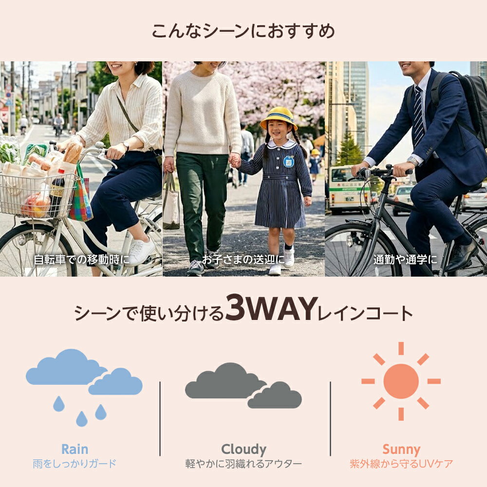 【クーポンで51%OFF】レインコート ポケット付 レディース レインポンチョ 3way 防水 二重袖 自転車 通学 通勤 紫外線 カジュアル おしゃれ(T)【予約販売】