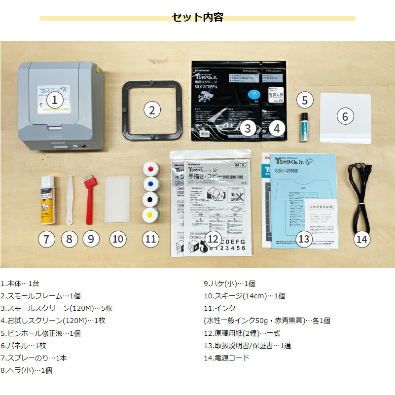 製品仕様 名称 Tシャツくんジュニア フレームサイズ(内寸) 150×150mm 最大プリントサイズ 約120×120mm 露光 蛍光放電管(ブラックライト) 電源 AC100V 50/60Hz 単相 本体寸法 (W×D×H) 約260×210×110mm 質量 1.5kg Tシャツくん おすすめ 機械 オリジナル 版 自作 手作り 作り方 手書き 作成 4色分解 レトロ印刷 シルクインク業者 販売 自宅 デザイン 自分で セルフ ロゴ デザイン イラスト おしゃれ 個人 作りたい 作る方法 作れるお店 DIY 道具 やり方 必要なもの 2色刷り 大量生産 乳剤長台 水性インク ゾルインク プラチゾルインク 発泡インク 蛍光インク 顔料インクアーティスト アイロン データ作り方 代用 印刷機 洗濯 高品質 版代なし 注文 データ 製版 キット 印刷 版画 プレス機 刷り台 露光 版 プリント素材 レザー 段ボール 合皮 革 ポリエステル プラスチック 紙 メッシュ 作れるもの・シーン 抜染 ステンシルフォント 胸ポケット ポスタータオル 体験 レンタル ボディ ベビー ノベルティ ワークショップ ホームセンター ペン 納期 版権 副業安い 誕生日 プリント 販売 やり方 バッグ トートバッグ エコバッグ ポーチご自宅でシルクスクリーンプリントを楽しめるエントリーモデル Tシャツくんジュニアセット コストを抑えても機能はそのままで、より小さな範囲への印刷に向いています。 片手サイズのフレームなので、より位置調整がしやすくなりました。 必要なものはすべてセットに入っているので、届き次第すぐにスタートできます。 様々なインクの種類があり、インクを変えると綿・ナイロン・ポリエステル・紙・木などのいろいろな素材にプリントが可能です。 デザインは印刷でも手書きでも作ることができます。 Tシャツくんで世界にひとつだけの1枚を作ってみましょう! ■約12cm角のスクリーンはおうちプリントや名前付けにぴったり! ■インクやスキージなど揃ったすぐに使えるフルセット ■一度版を作れば何回も色を変えて印刷できる! ■片手サイズのフレームは、プリント位置思いのまま ※Tシャツくんシリーズ製版可能サイズ一覧はこちら(PDF:260KB)をご覧ください。 ■もっと大きくTシャツに印刷したい方は「Tシャツくんミドルセット」がおすすめ! ■本格的なウェアプリントビジネスを始めたい方は「Tシャツくんワイド製版セット」がおすすめ! メッシュ状のスクリーンに孔(あな)をあけ、上からインクを落としてデザイン部分にのみインクがプリントされる方法です。スクリーンをフレームに張ったものを版(はん)と呼び、一度版を作成すればその版を使って同じデザインを何枚も刷ることができます。 2色刷りの記事はこちら >> ポストカードの記事はこちら >>