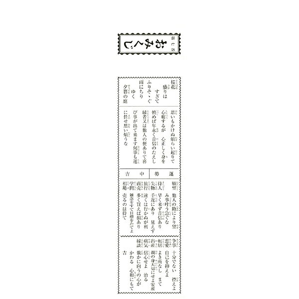 ■折込み済 おみくじ箋 凶なし (500枚)●抽選用品【商品番号】No.14377折込み済 おみくじ箋 凶なし (500枚)【セット内容】 大吉34・中吉14・吉14・小吉18・末吉20(凶はなし)/100枚【大きさ】折込済大きさ 1枚/5.5×2.5cm【素材】洋紙